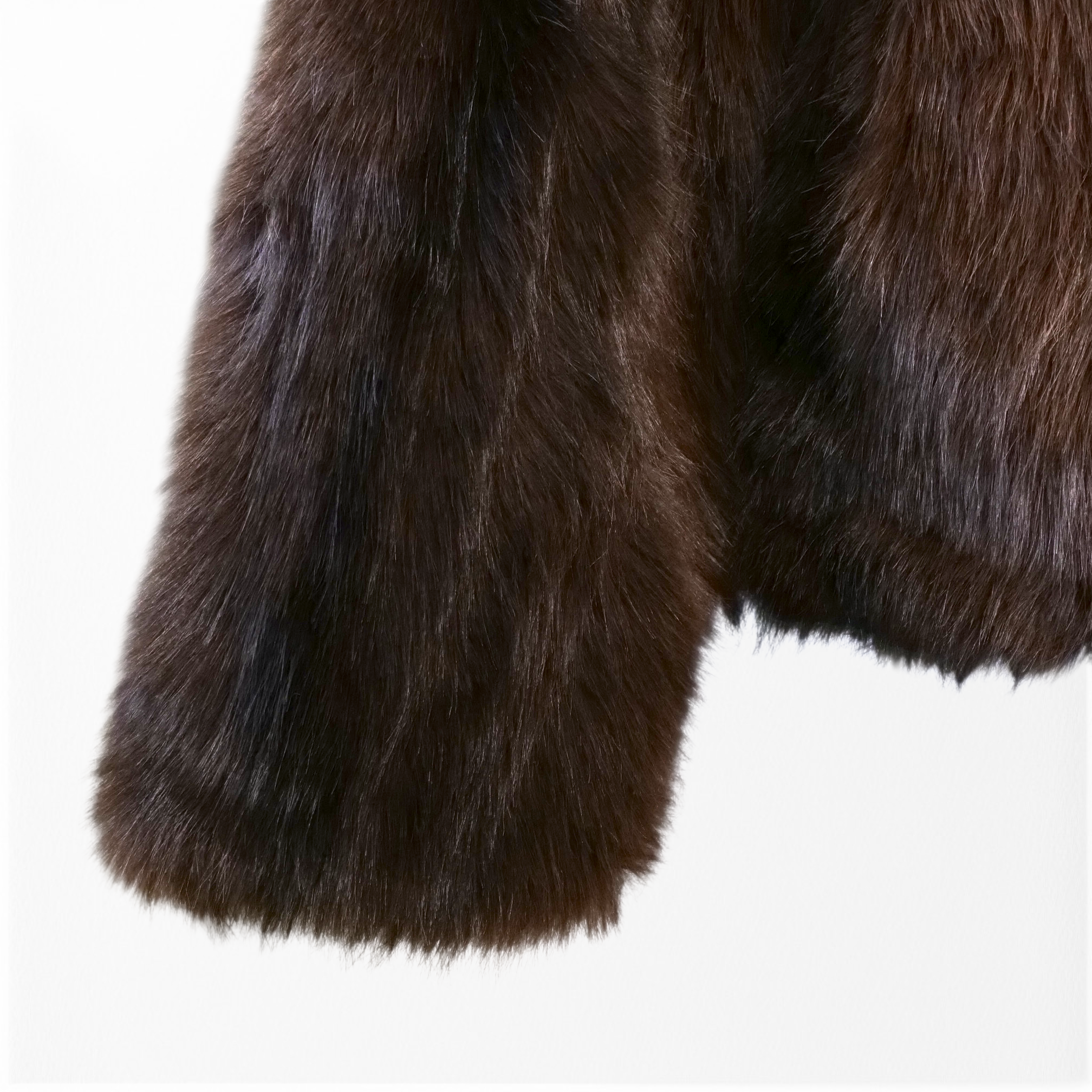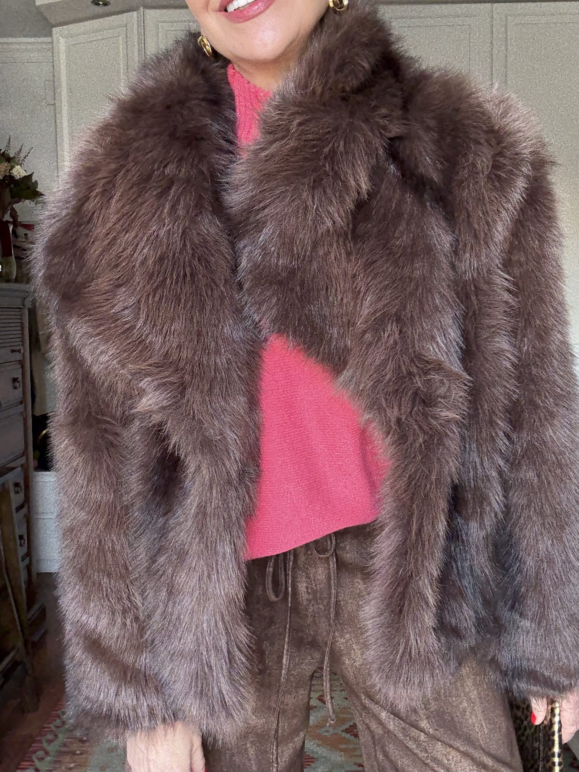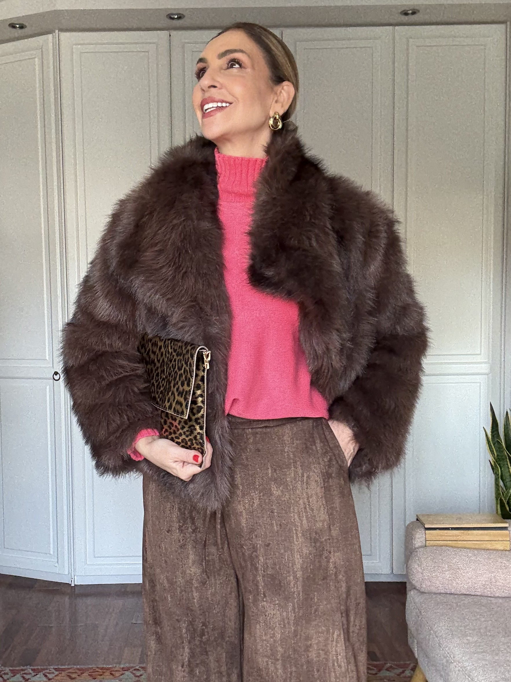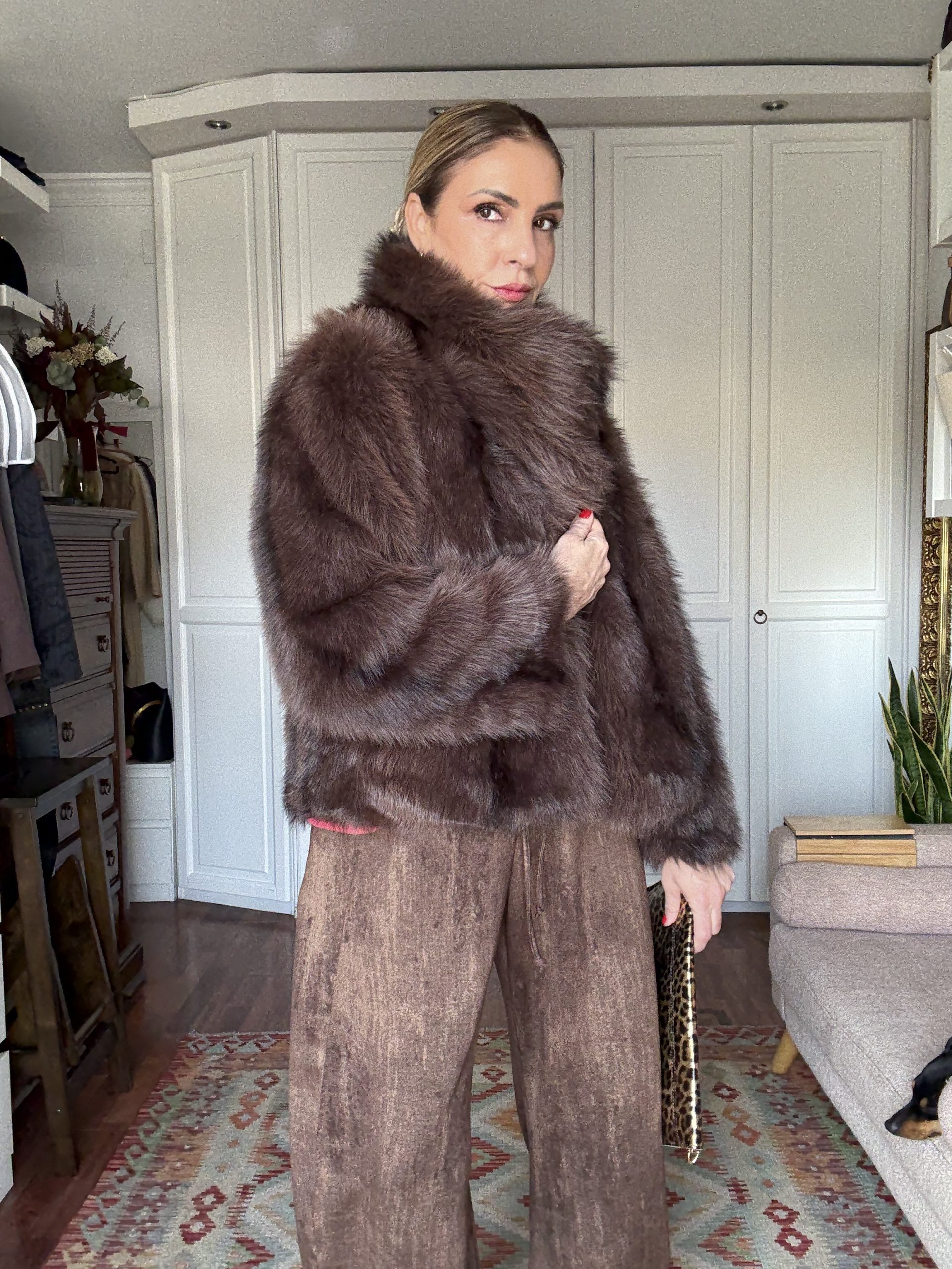 Abrigo corto de cuello solapa y manga larga. Bolsillos delanteros y forro interior. Bajo recto. Detalle de aplicación de pelo. Cierre frontal con botones ocultos.
