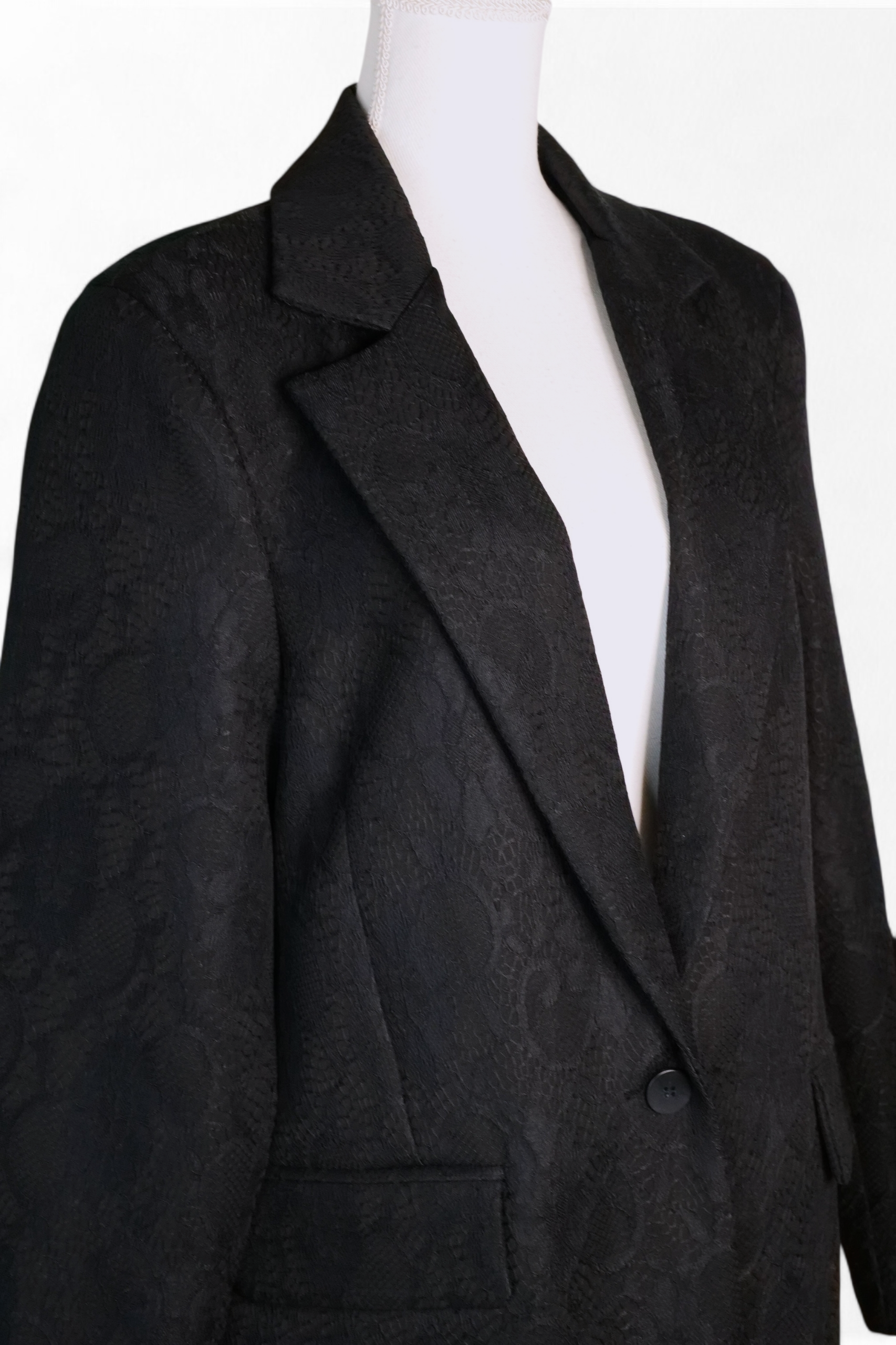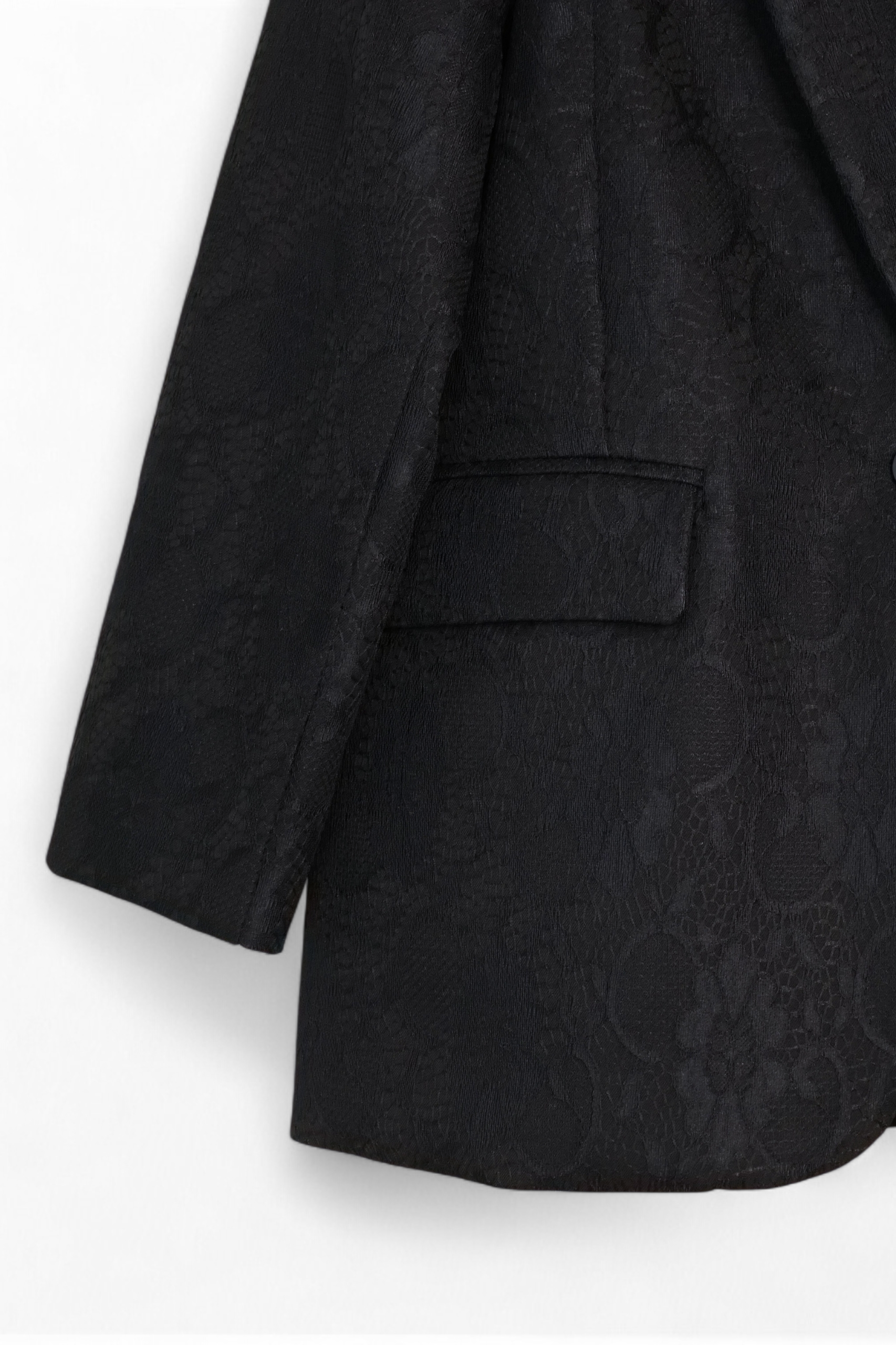 Blazer de encaje en color negro. Con hombreras, solapa y cierre de botón delantero. Bolsillos decorativos delanteros.