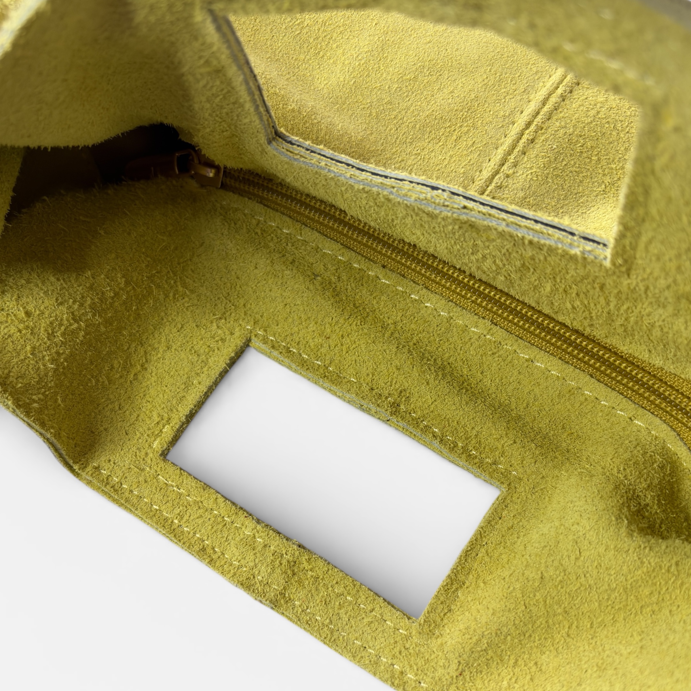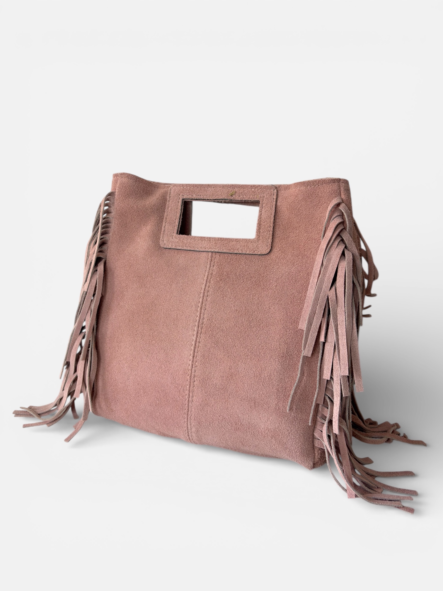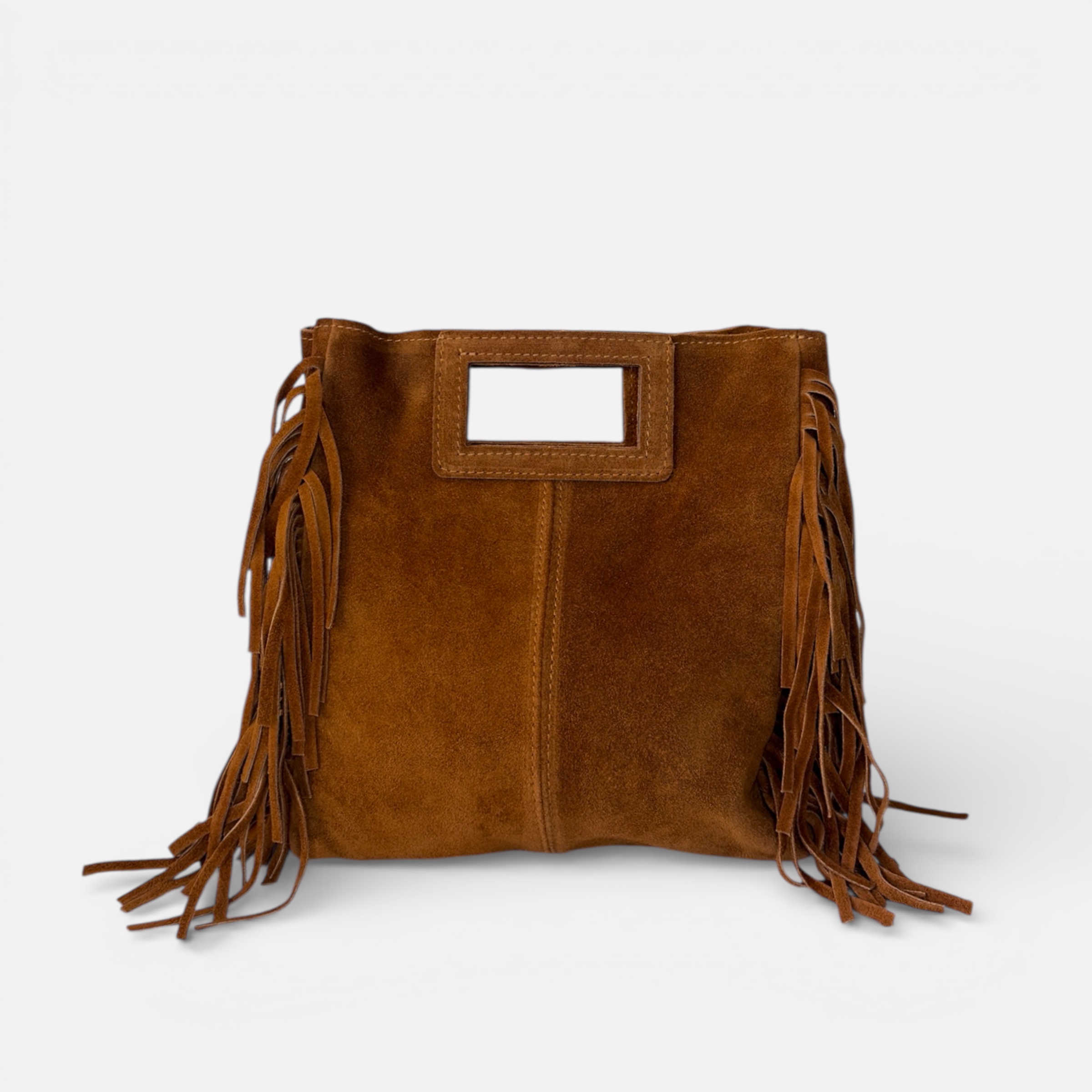 Bolso de mano con flecos decorativos a ambos lados y un asa rectangular calada en la parte superior.
