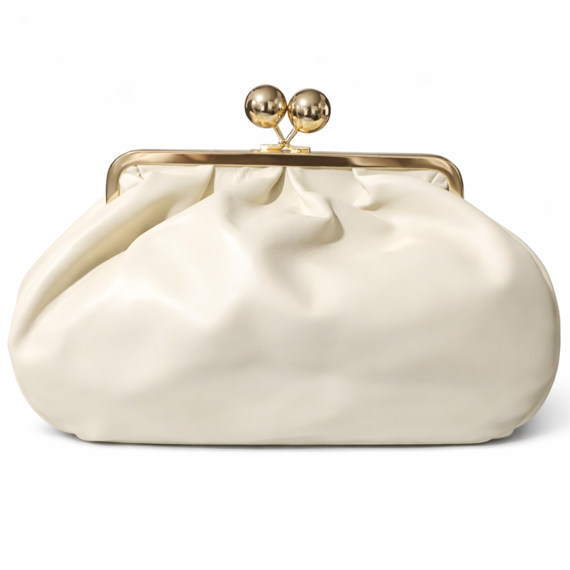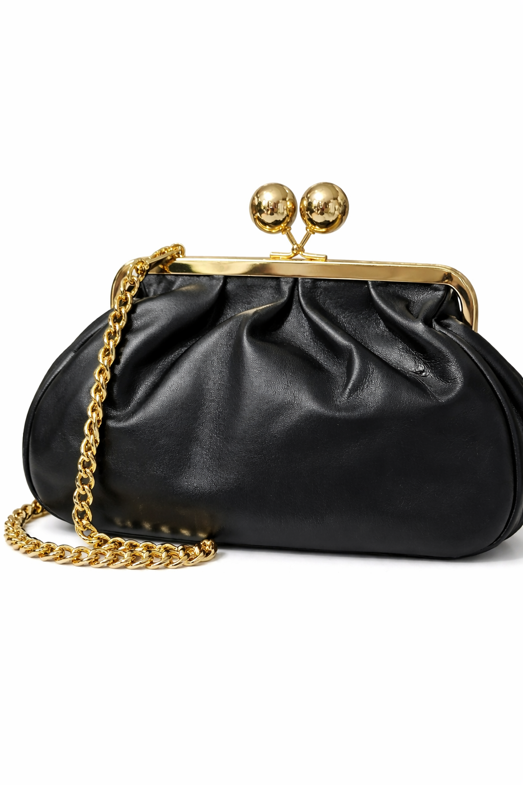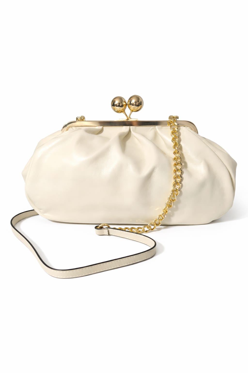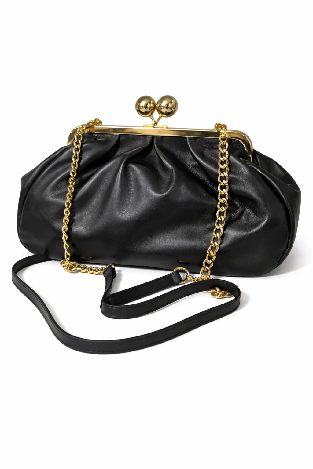 Bolso de mano tipo clutch fruncido, confeccionado en suave piel. Tiene un cierre de boquilla con dos bolas. Incluye correas extraíbles, con cadena.