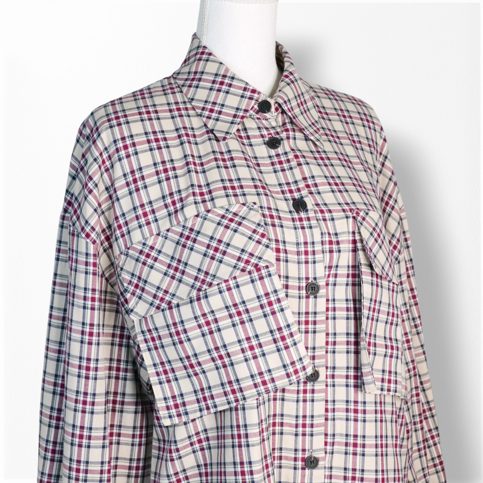 Camisa estampada de cuadros con cuello solapa. Lleva 2 maxi bolsillos en delantero. Cierre de botones en frontal y puños. Corte oversize con hombros caídos.