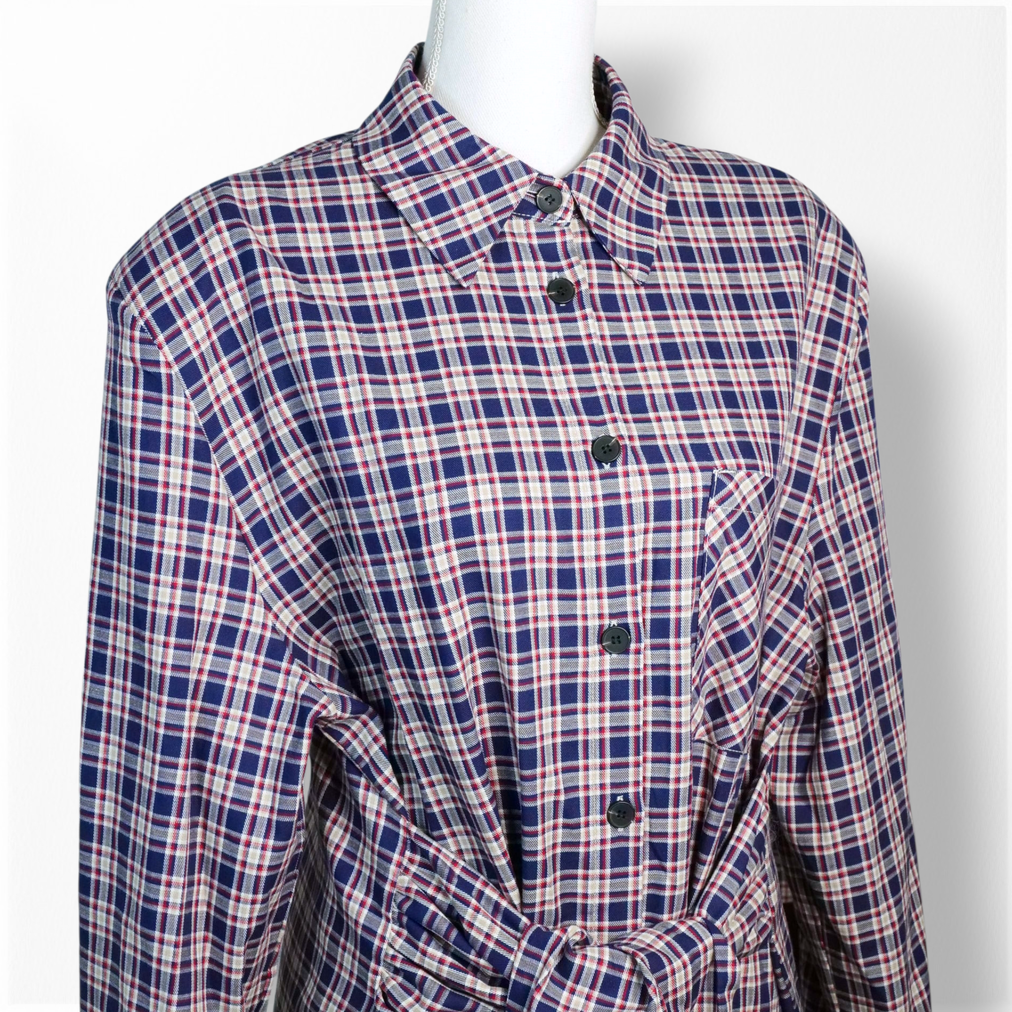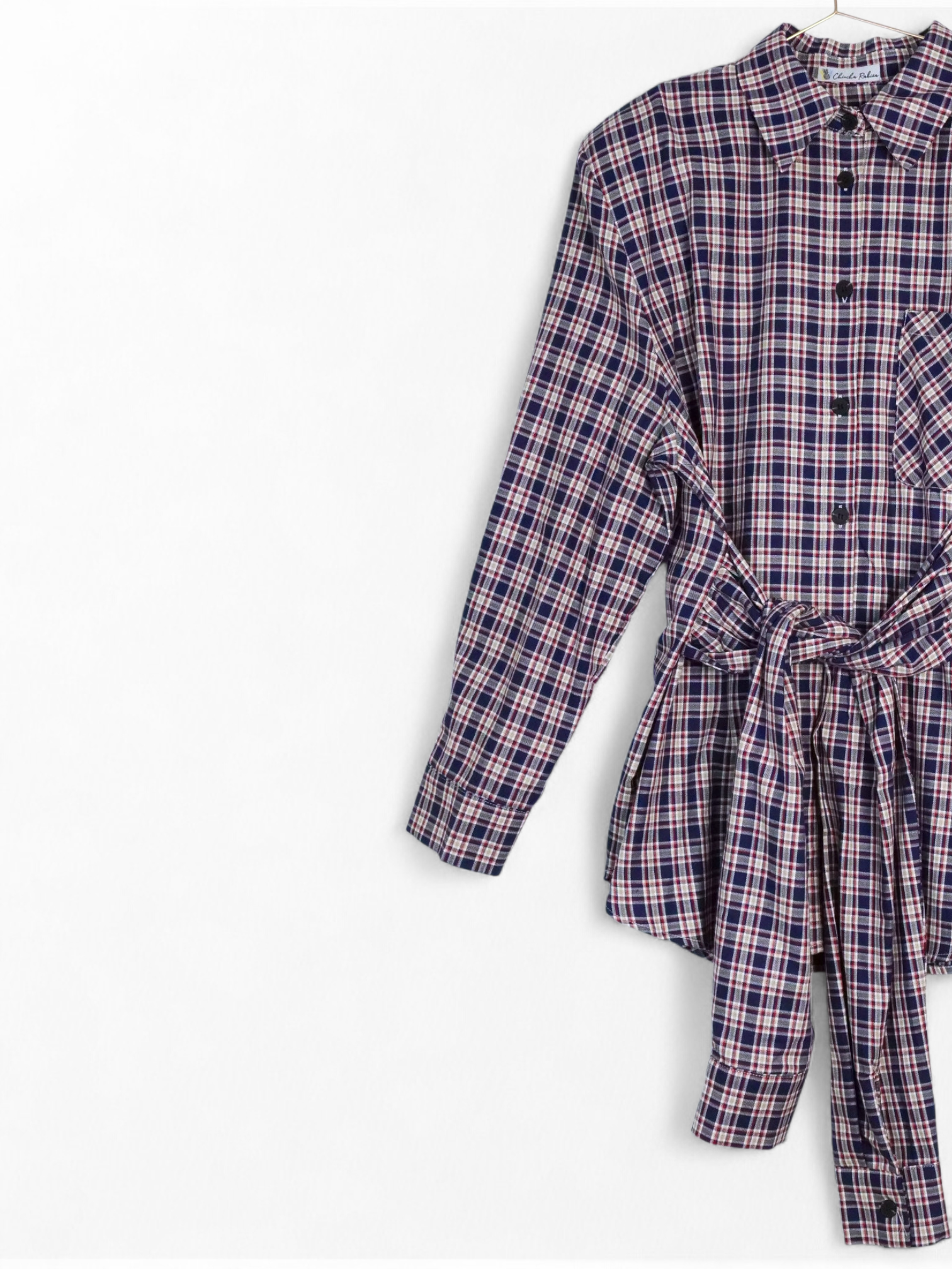 Camisa de estampado cuadros con cuello. Cierre de botones. Bolsillo delantero. Lazada decorativa en la zona de la cintura. Con hombreras.