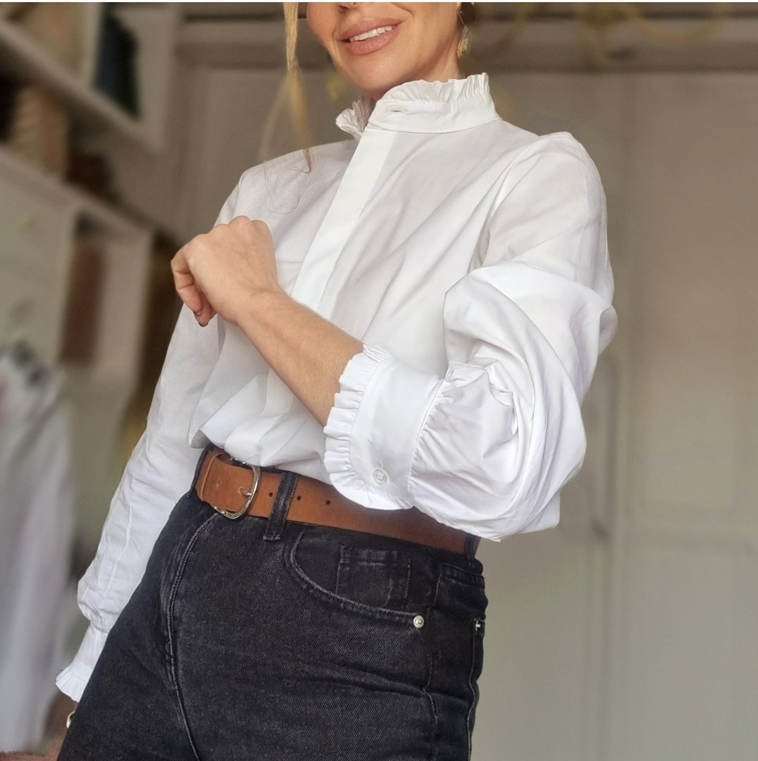 Camisa de cuello redondo y manga larga. Detalle de bordados a tono con jaretas y entredoses. Acabados en volante. Cierre frontal con botones forrados en el mismo tejido.