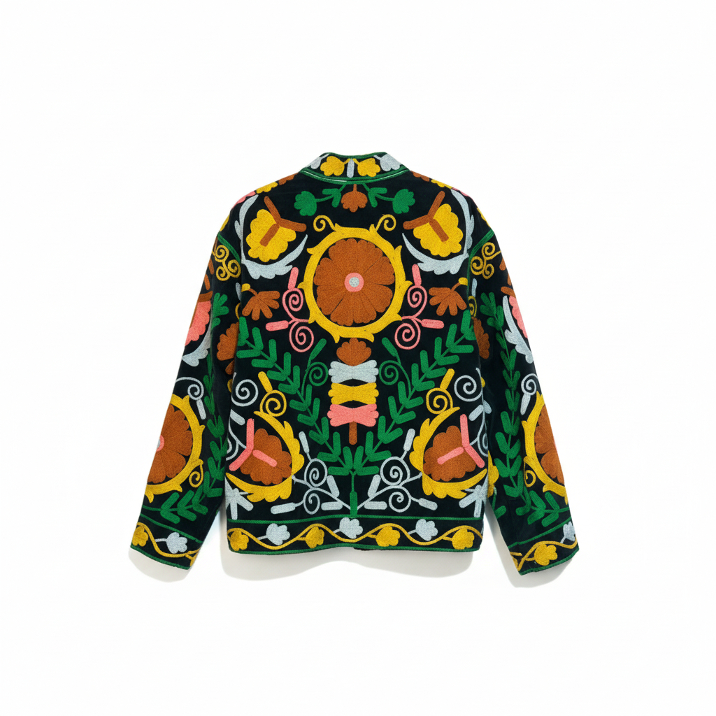 Chaqueta de algodón con diseño de étnico. Presenta un diseño bordado multicolor de flores. Con forro interior.