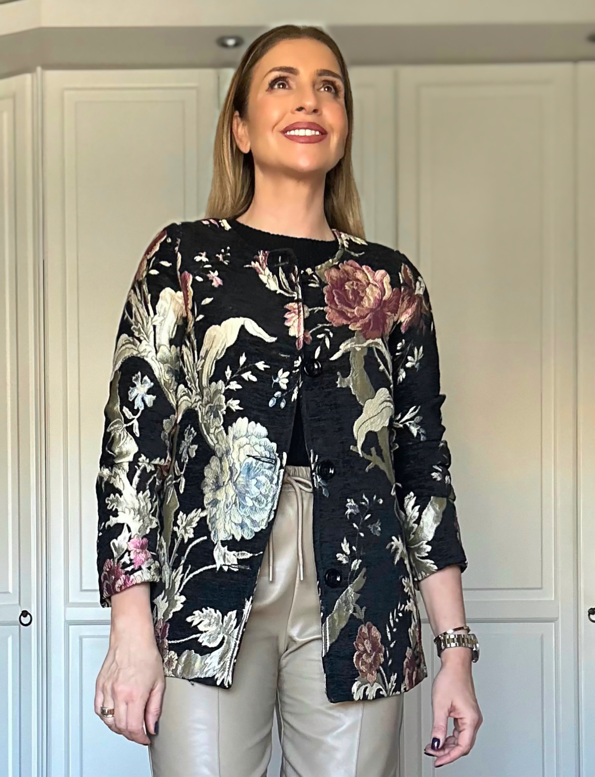 Chaqueta de corte clásico con cuello redondo. Cierre frontal con botones. Lleva dos bolsillos laterales. Totalmente forrada. Tejido acolchadito y calentito.