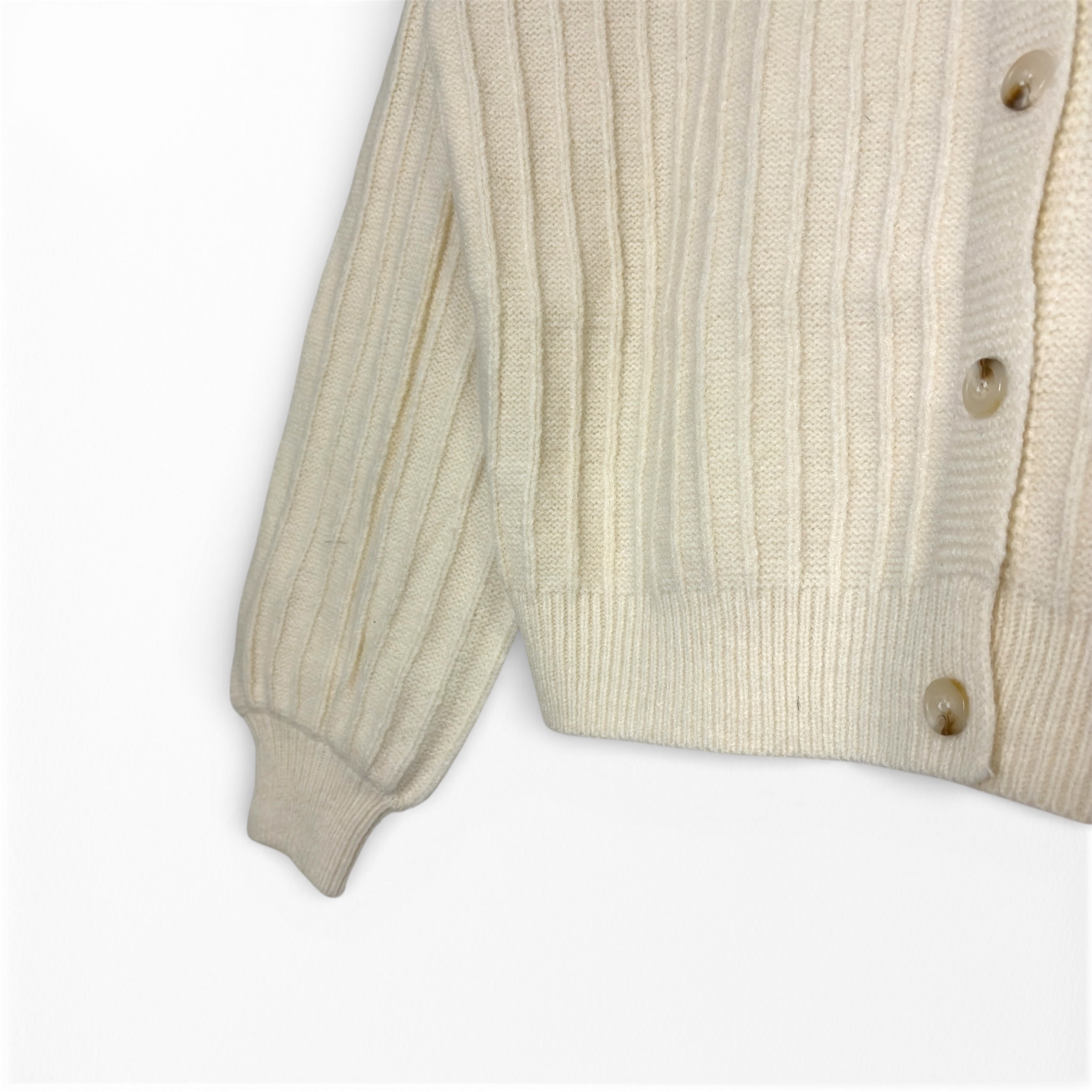Chaqueta de punto con cuello redondo y manga larga. Cierre frontal con botones. Detalle de flores bordadas.