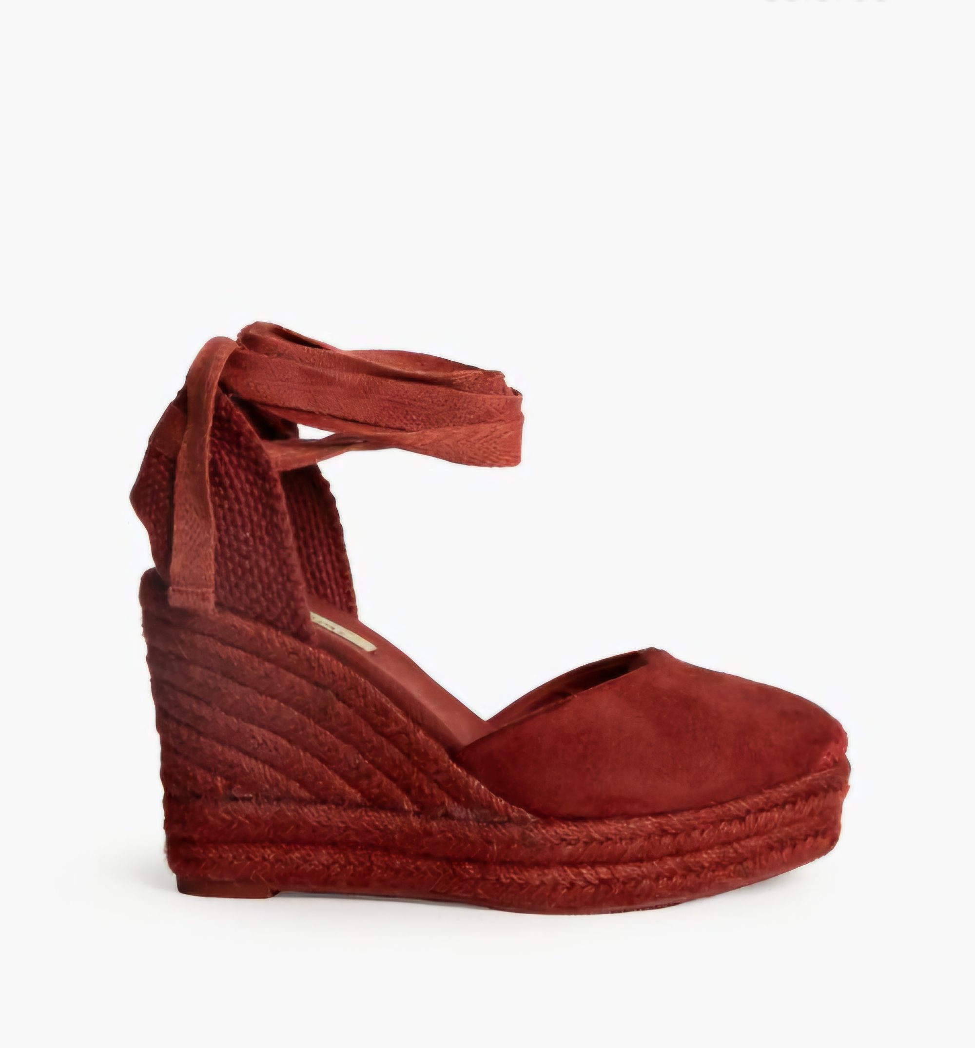 Plataforma tipo valenciana, con cuña en yute. Corte acabado en redondo en ganchillo. Cierre mediante tiras anudadas al tobillo. Puntera reforzada.
