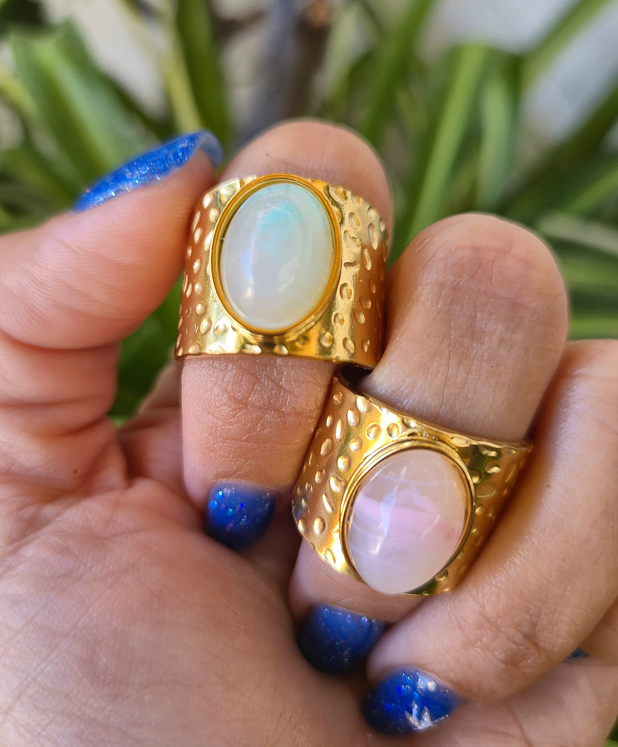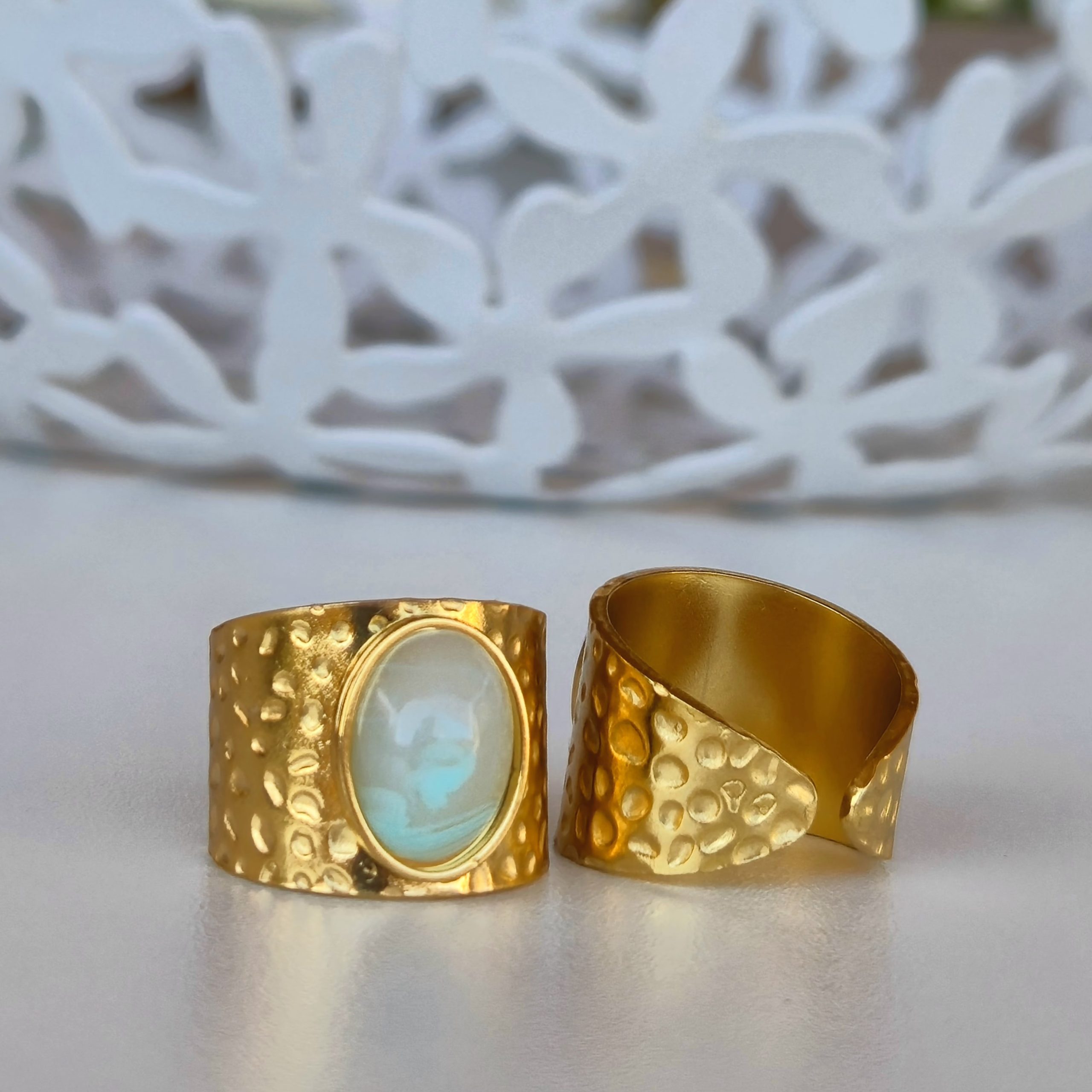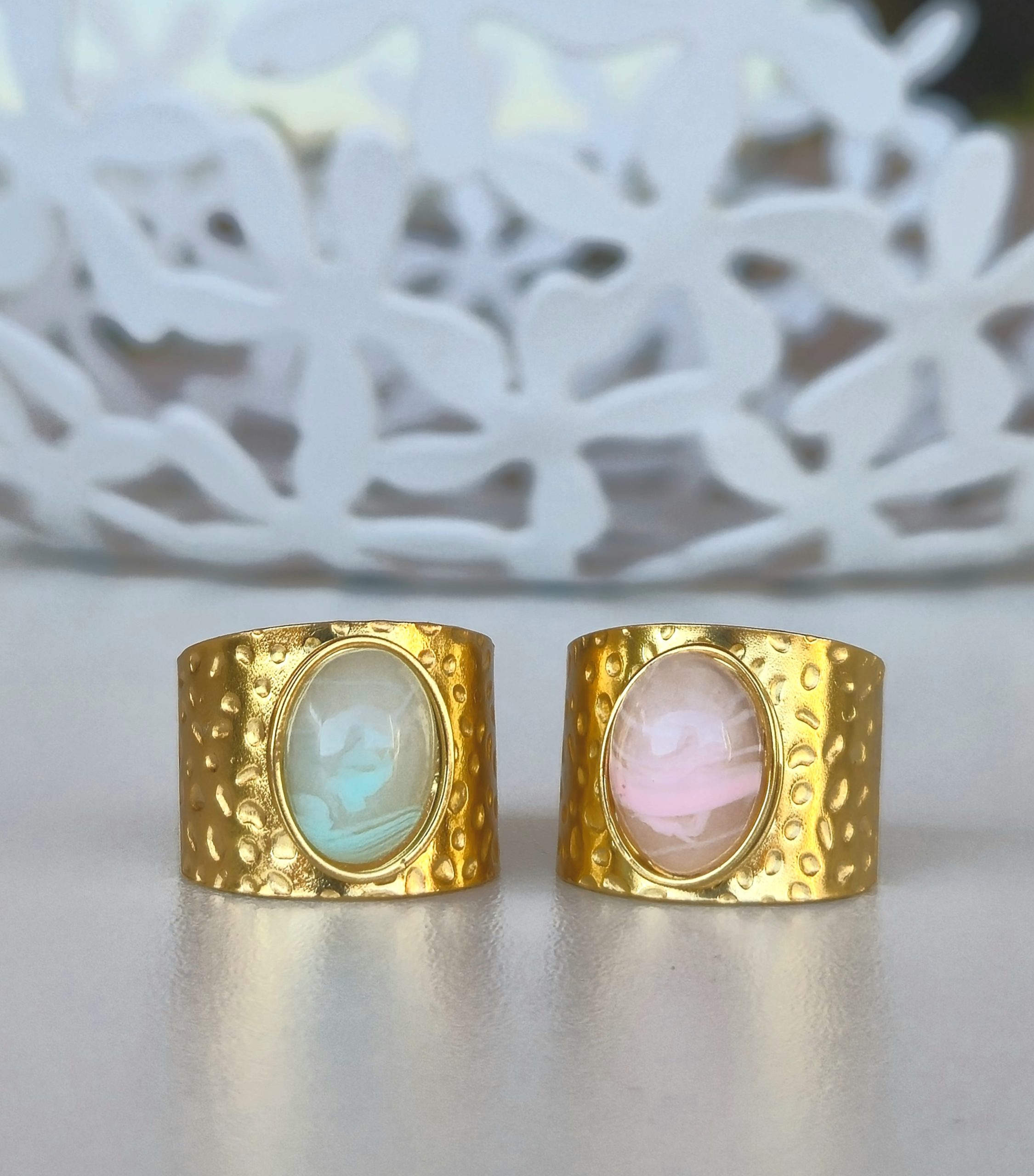 Pack de anillos metálicos en color dorado con aplique central tipo piedra preciosa. Ajustables.