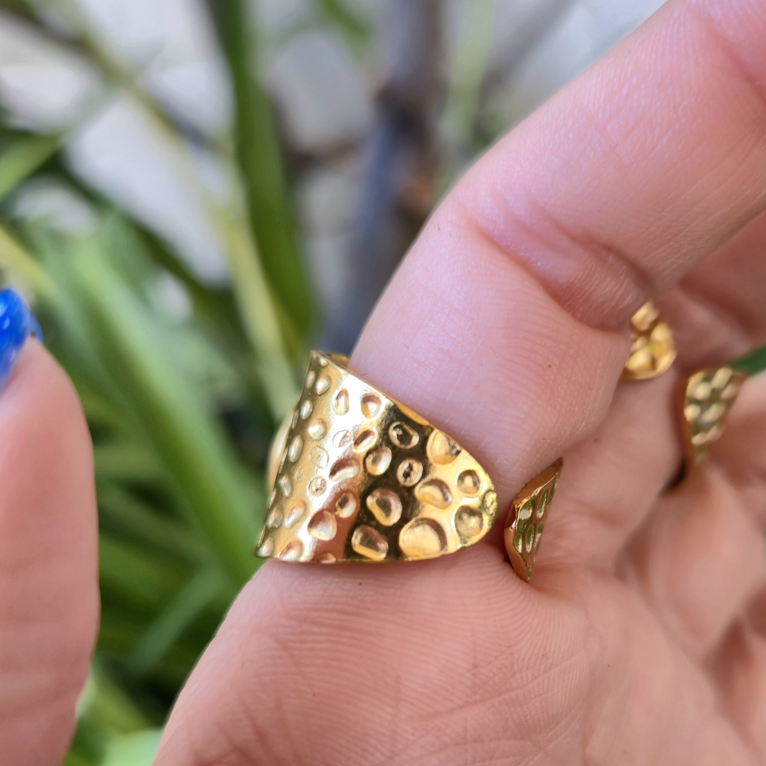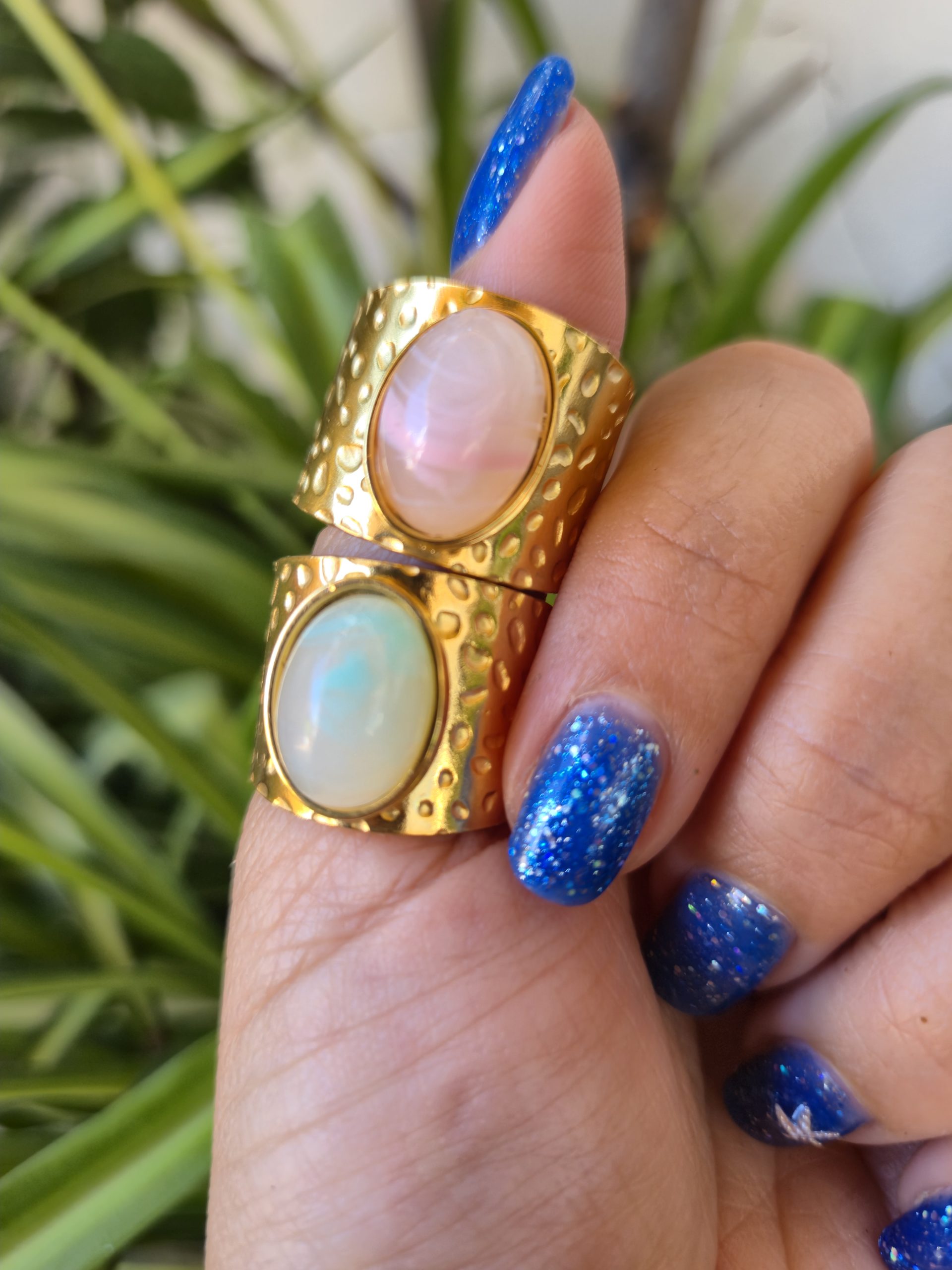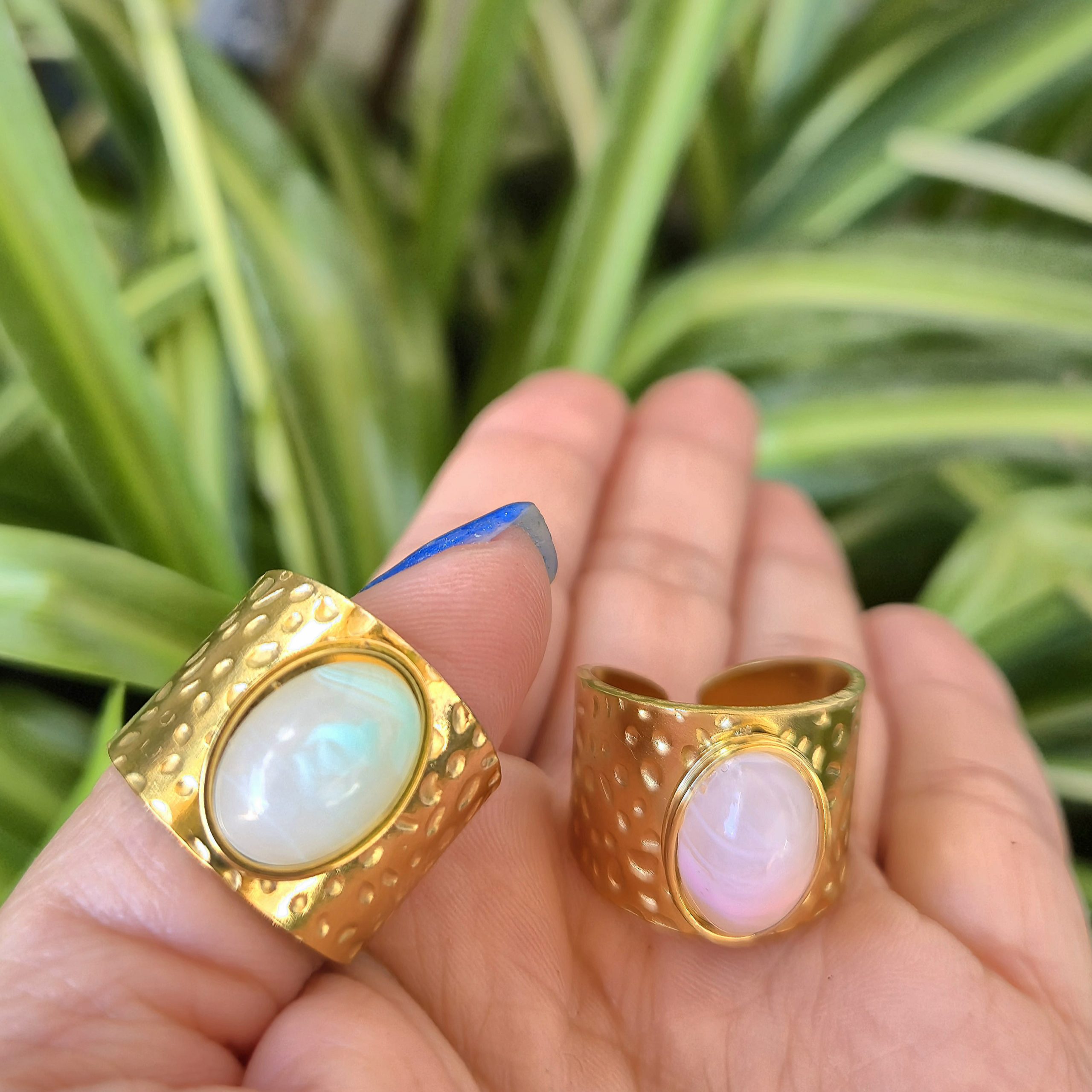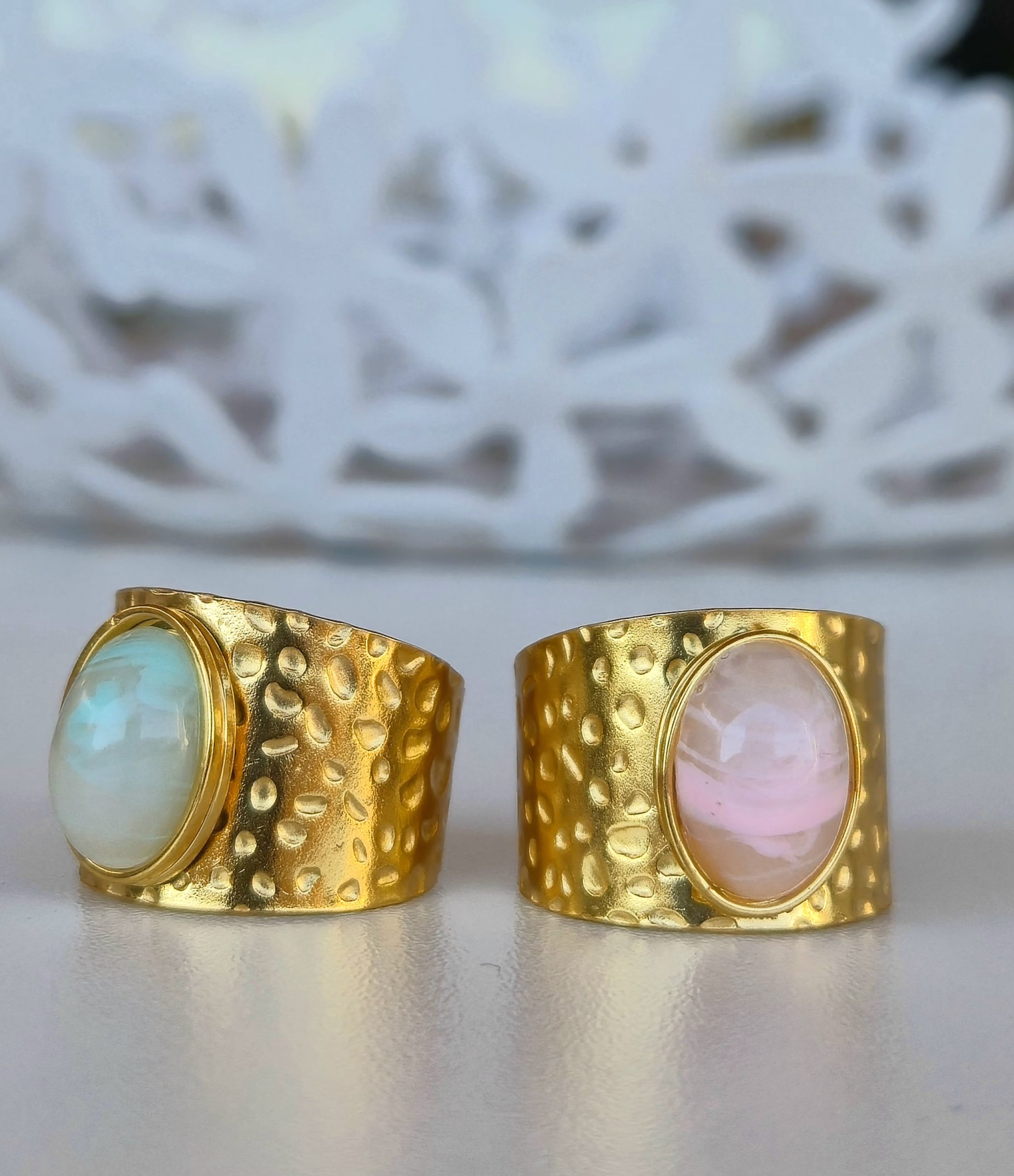Pack de anillos metálicos en color dorado con aplique central tipo piedra preciosa. Ajustables.