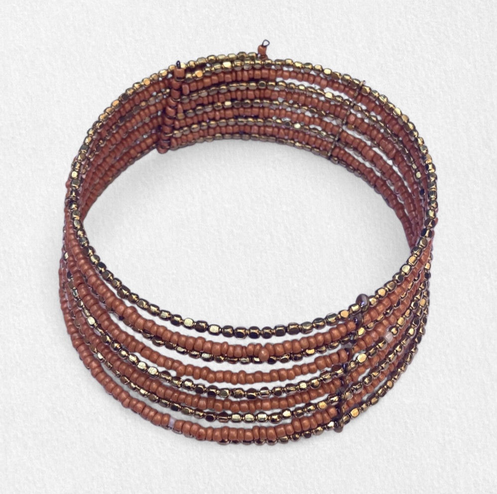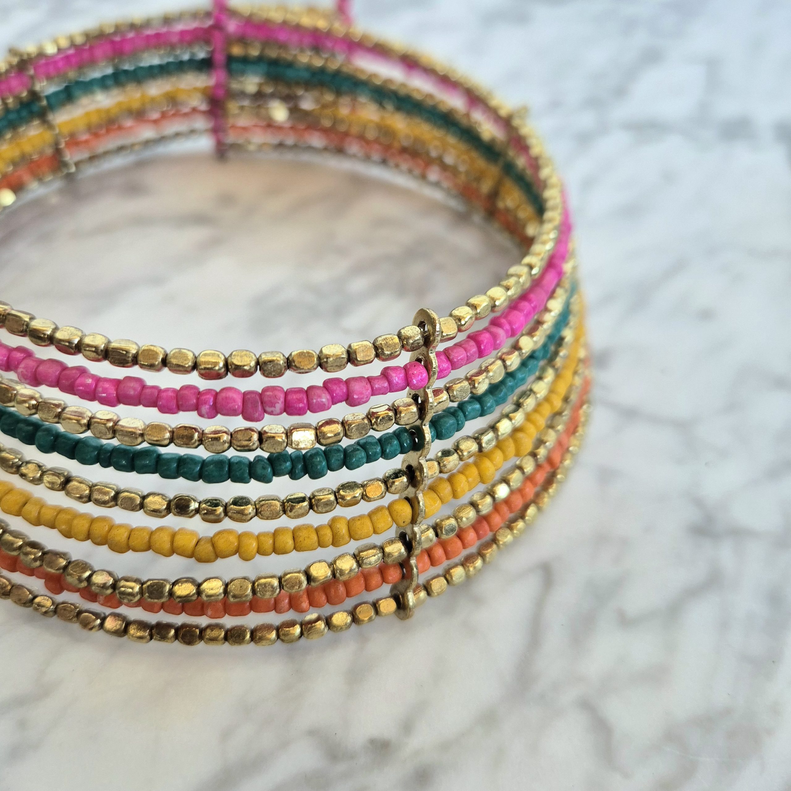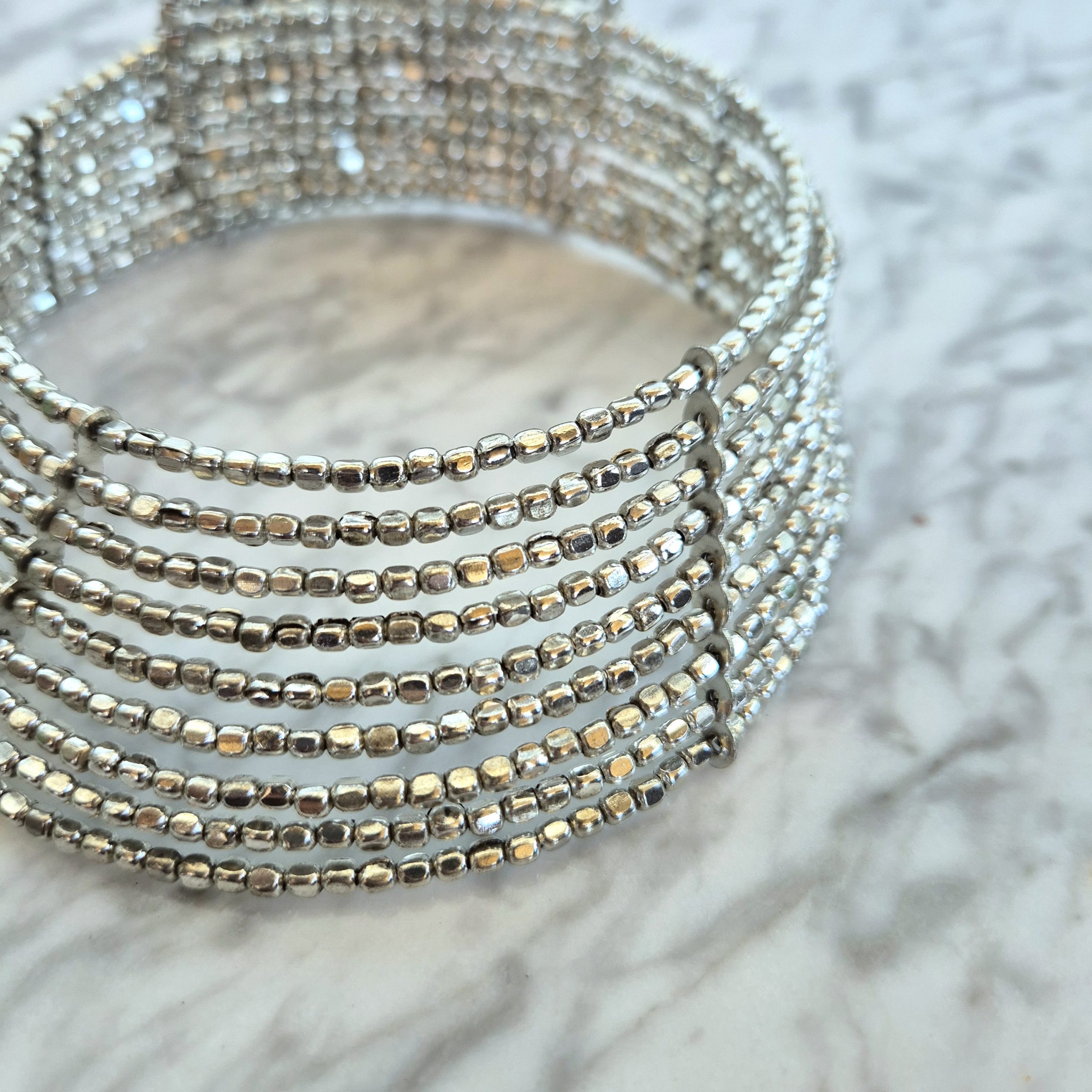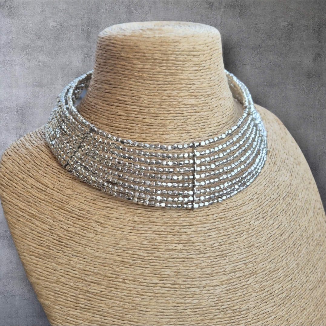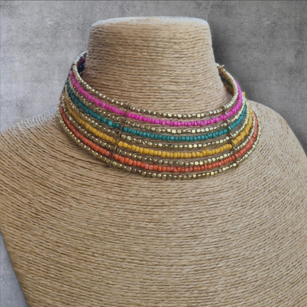 Collar con estructura de alambre cubierta de abalorios. Se adapta a diferentes grosores de cuello y se puede llevar más o menos cerrado.