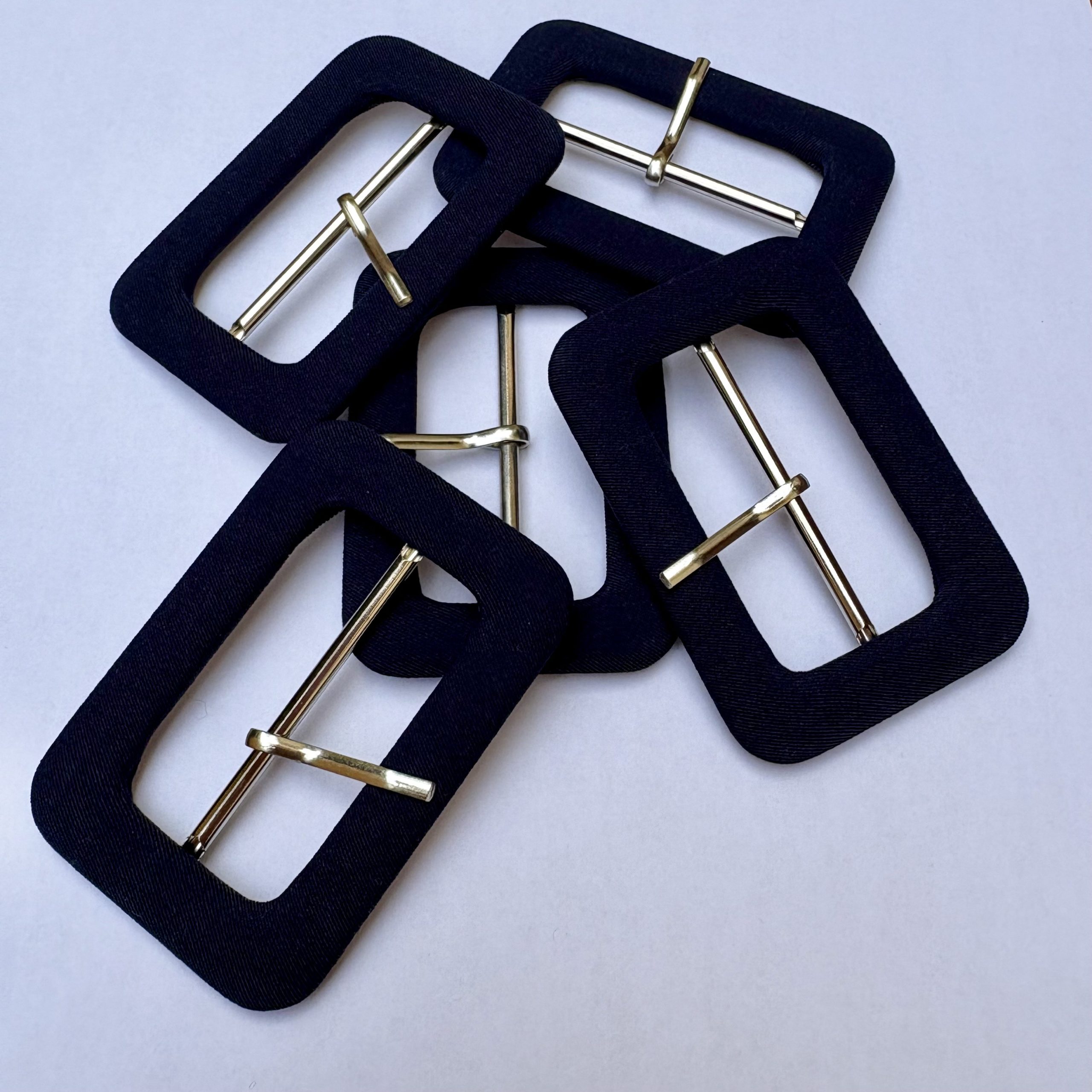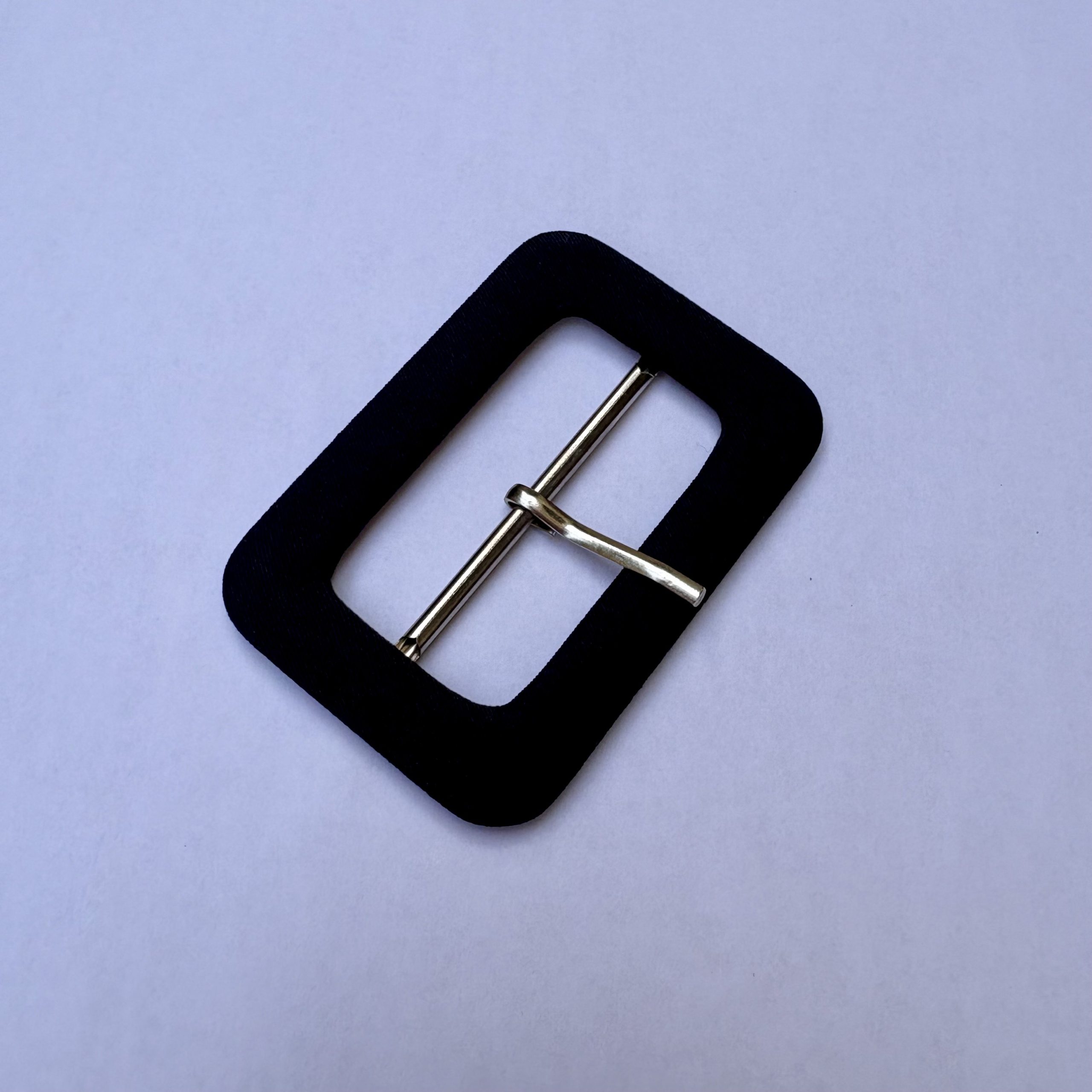 Hebilla rectangular con forro de tela en color negro. Perfecta para pañuelos con un toque en plateado simple y elegante.