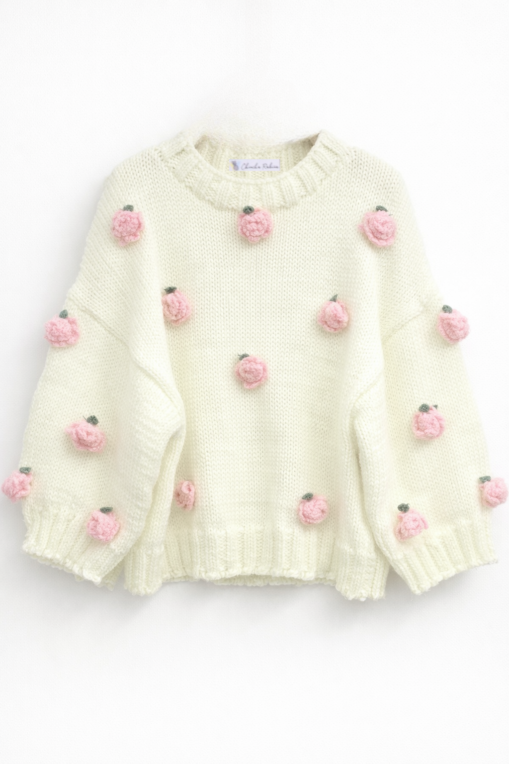 Jersey oversize con hombros caídos y mangas abullonadas. Adornado con flores de crochet. Cuello redondo, puños y bajo acanalados con un ligero efecto rústico en los bordes.