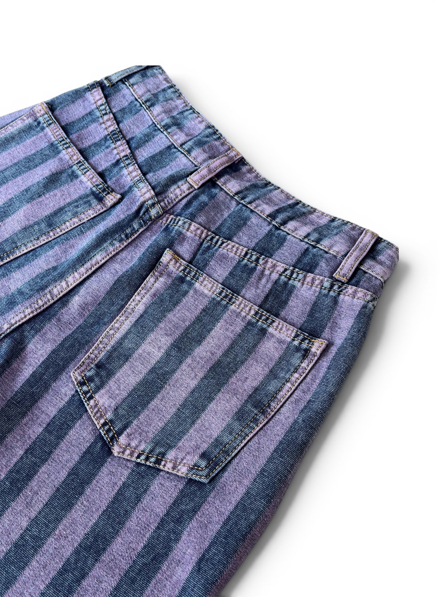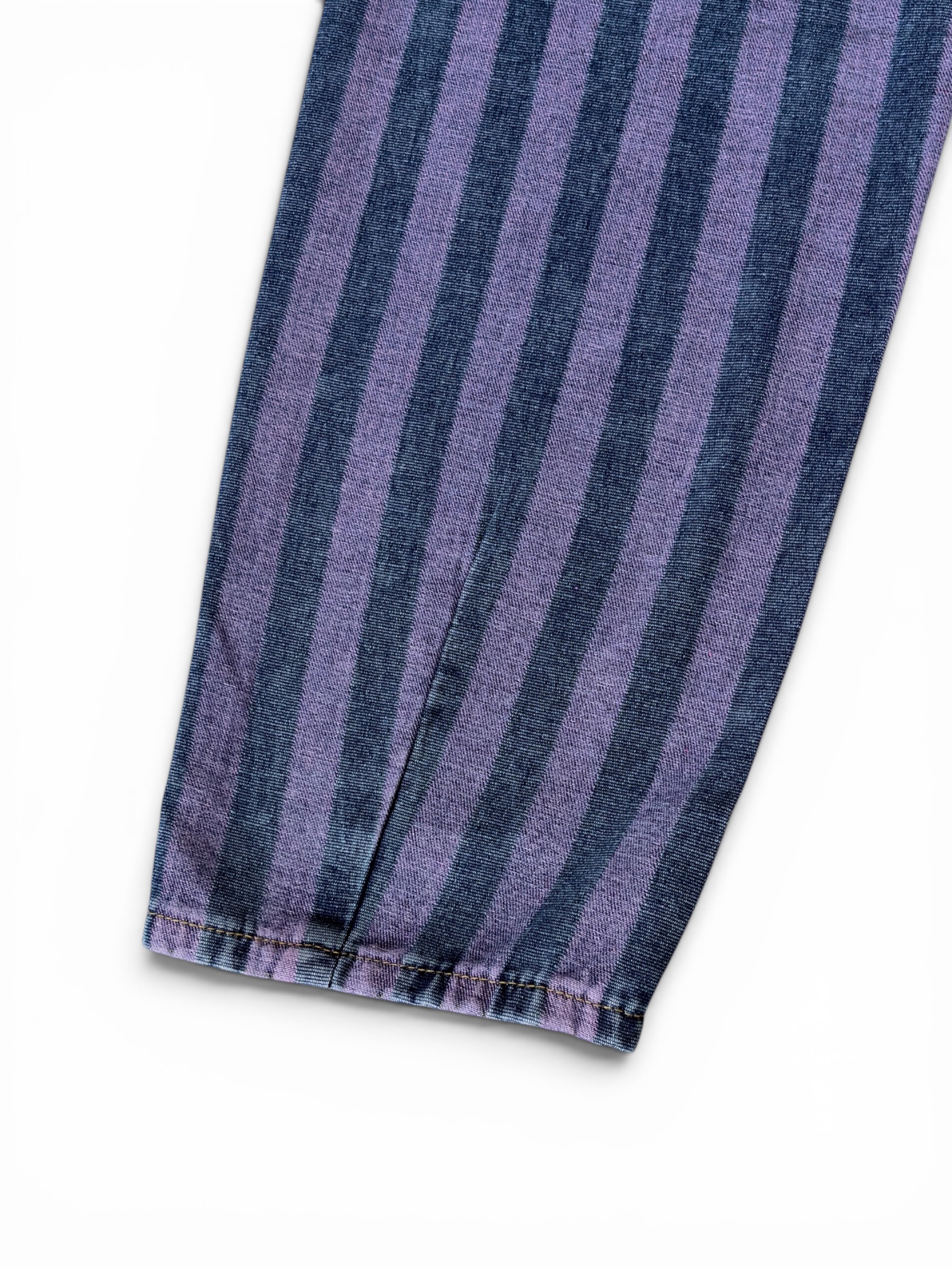 Pantalón vaquero de rayas verticales en tonos morados y azules. Bolsillos delanteros y traseros.