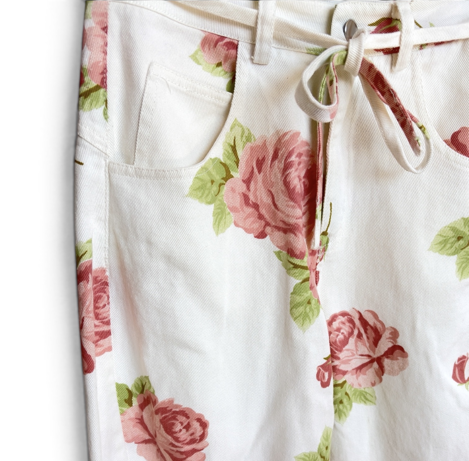 Pantalón tipo baggy con estampado rosas vintage en tonos rosados y hojas verdes sobre un fondo blanco marfil. Tiro alto con un lazo ajustable del mismo tejido. Bolsillos delanteros y traseros.