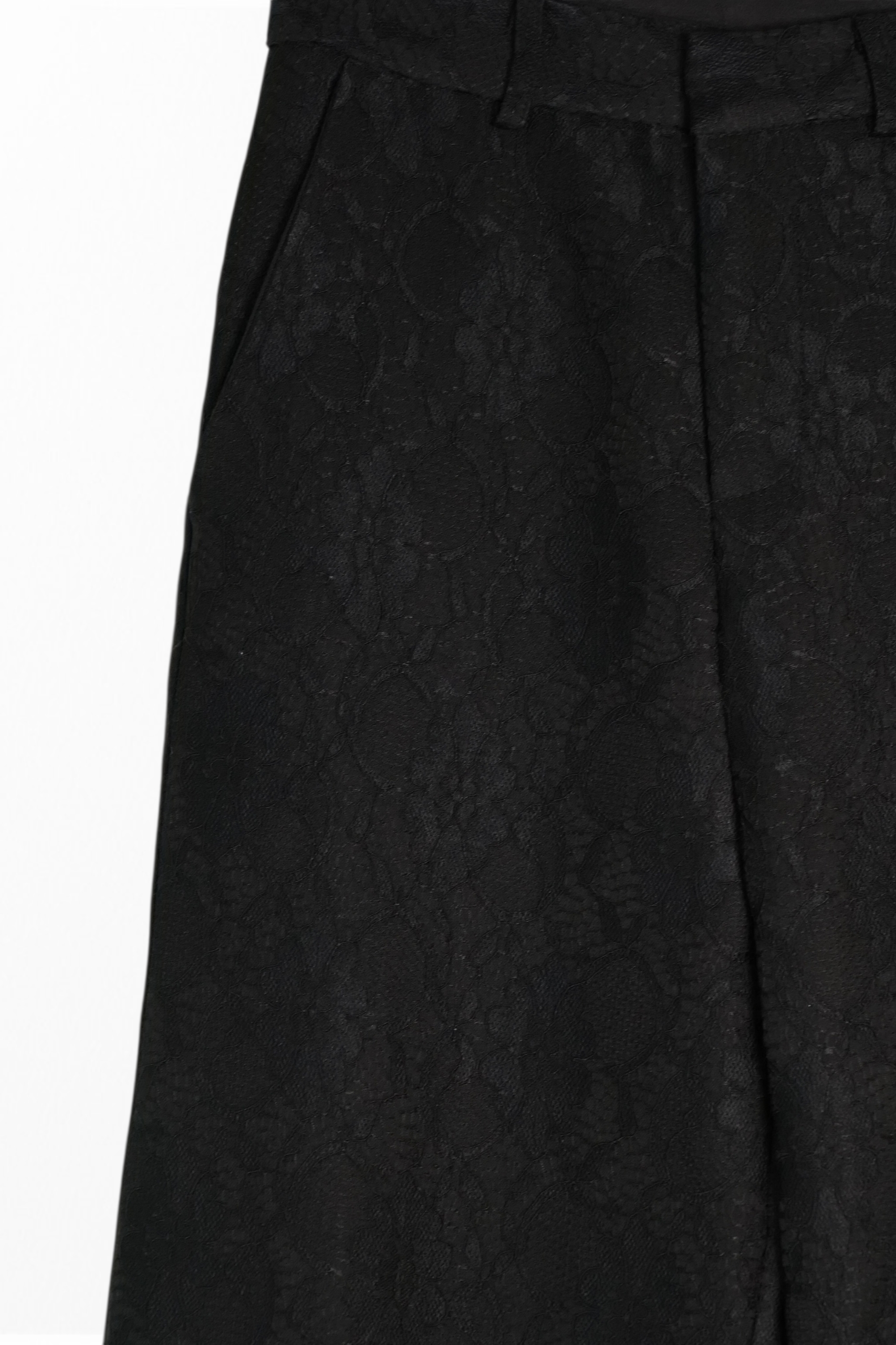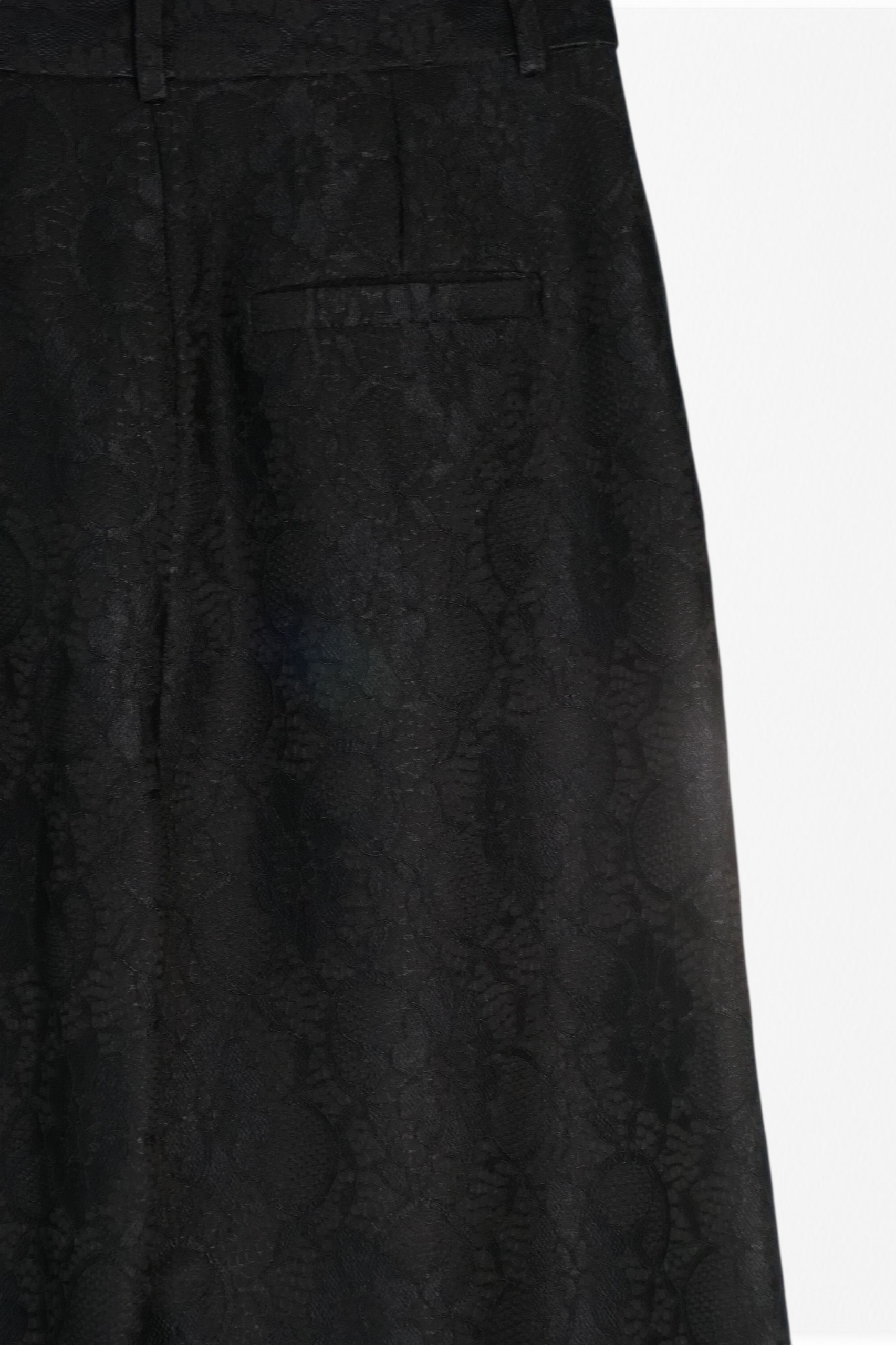 Pantalón de vestir. Pernera ancha. De tiro alto con un tejido de encaje. Trabillas en la cintura y cierre frontal de cremallera oculta y gancho. Bolsillos delanteros.