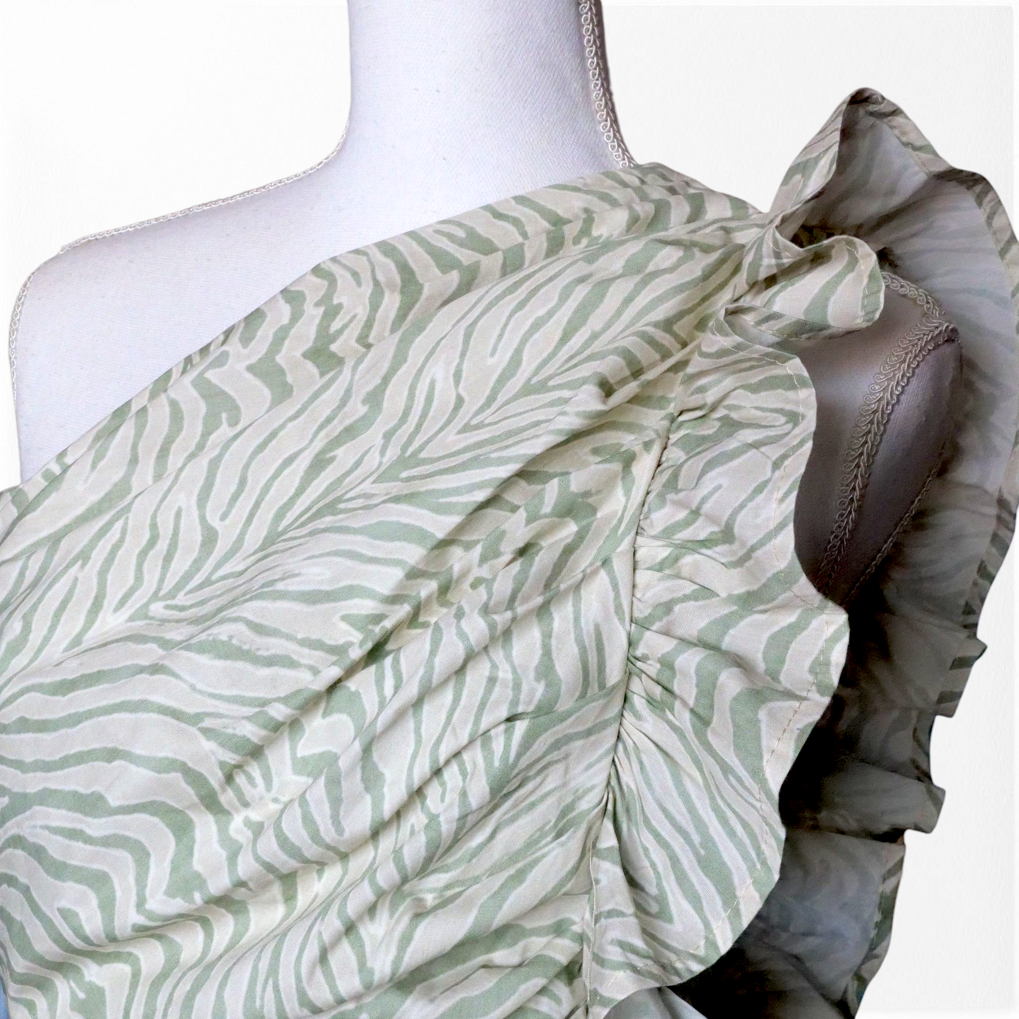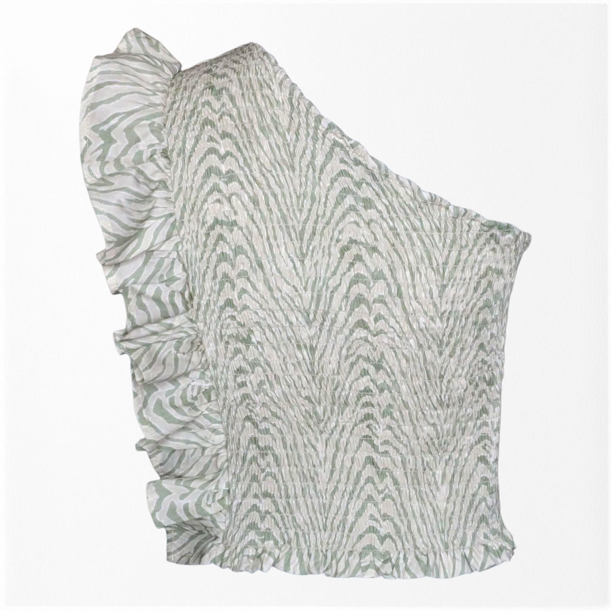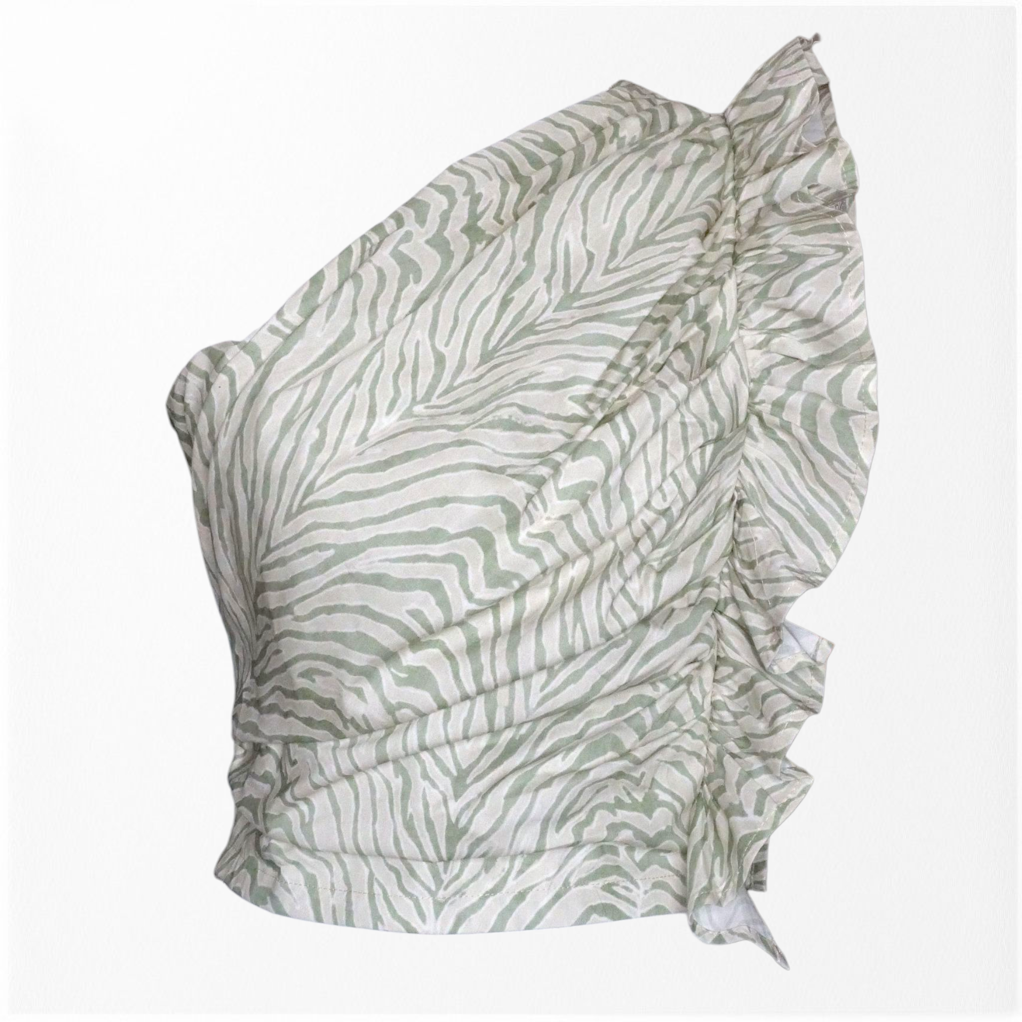 Top de corte asimétrico fruncido. Con detalle de volante en la sisa. Con estampado animal print y espalda elástica con nido de abeja.