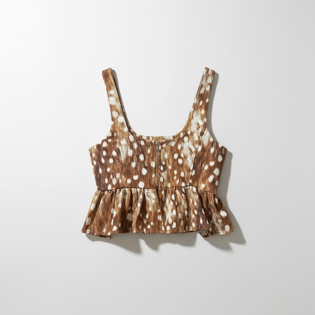 Top de algodón con estampado animal print integral. Amplio escote en U en la parte delantera. Volante en la parte inferior. Cierre de cremallera central en la espalda.