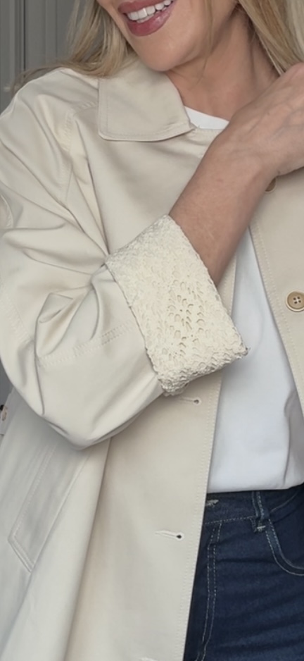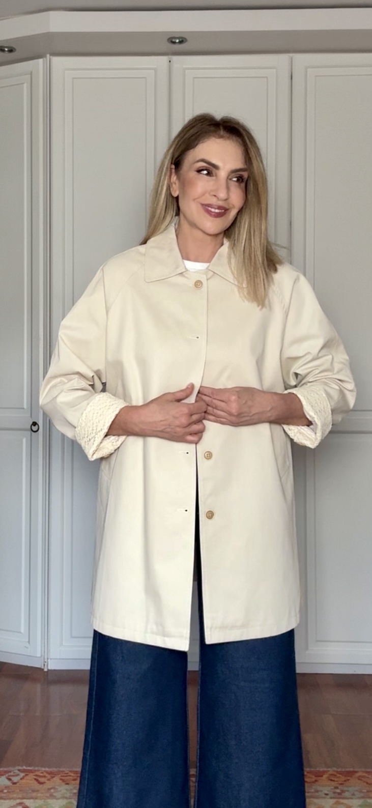 Trench amplio de corte recto y cuello solapa. Manga larga con detalle de bordado crochet en el puño. Bolsillos en delantero. Forro interior. Cierre frontal con botones.