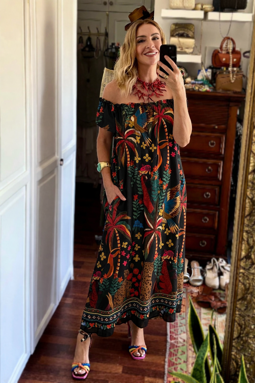 Vestido midi con escote recto elástico en nido de abeja y hombros descubiertos. Con cintas para fruncir escote y hacer moña  o lazada al cuello. Terminado en volante.