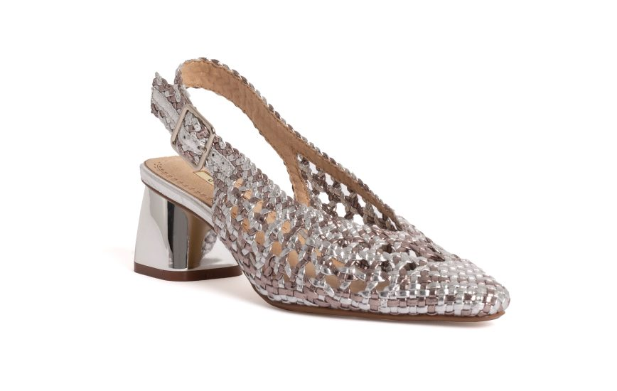 Zapato de salón destalonado con tacón bajo metalizado. Material efecto piel trenzado. Cierre de hebilla al talón. Muy cómodos y estables.