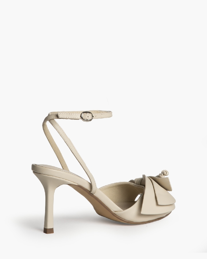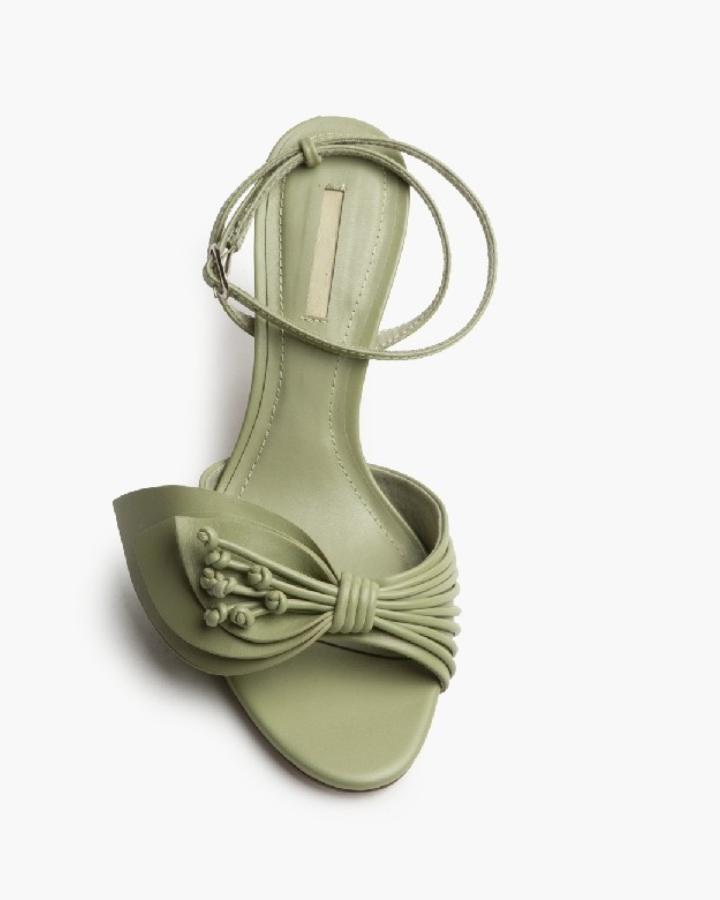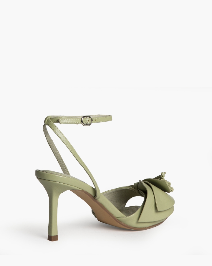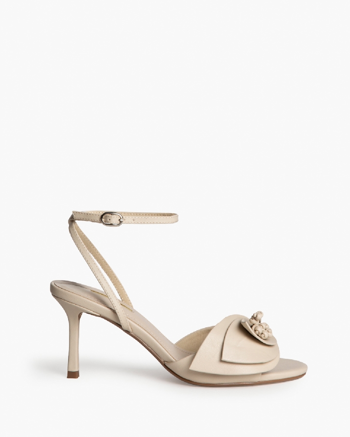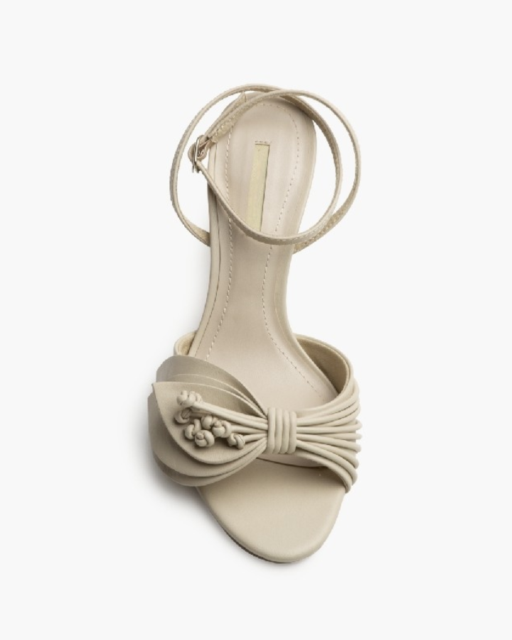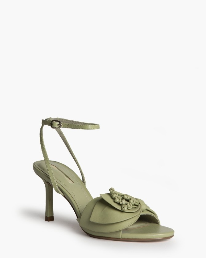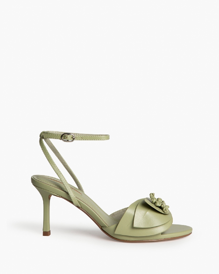 Sandalia de tacón alto. Adorno de flor en la punta. Cierre mediante hebilla en la pulsera del tobillo. Acabado en punta redonda.